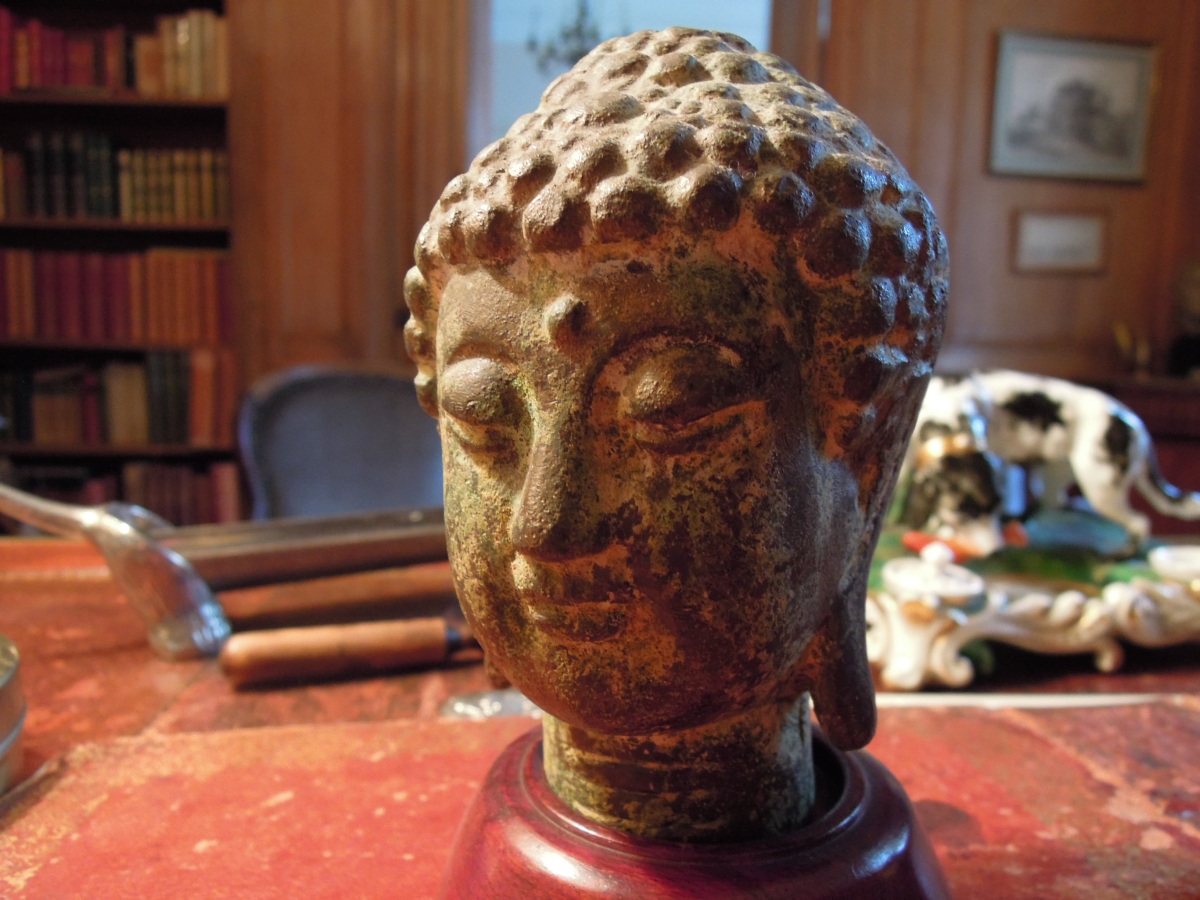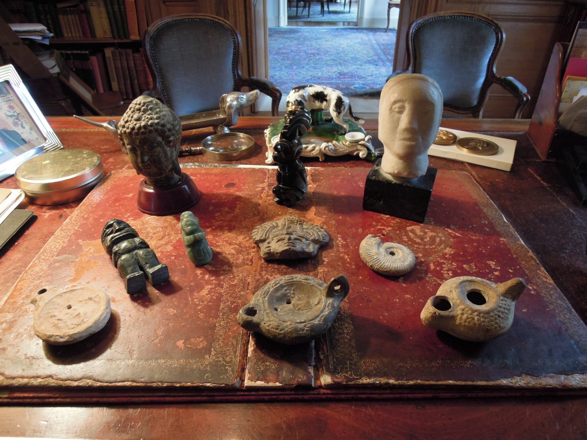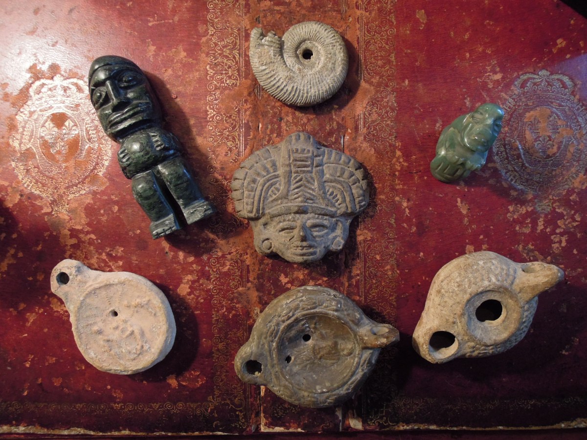 ARCHÉOLOGIE. TÊTE en marbre blanc (Haut. 12 cm), TÊTE en bronze (Haut. 11,5 cm), trois LAMPES À HUILES en terre cuite, MASQUE MÉSOAMERICAIN en terre cuite (Larg. 9 cm) , CONQUE fossilisé (Diam. 6,5 cm), trois FIGURINES en pierre sculptées (Haut. de 4,5 à 12 cm)