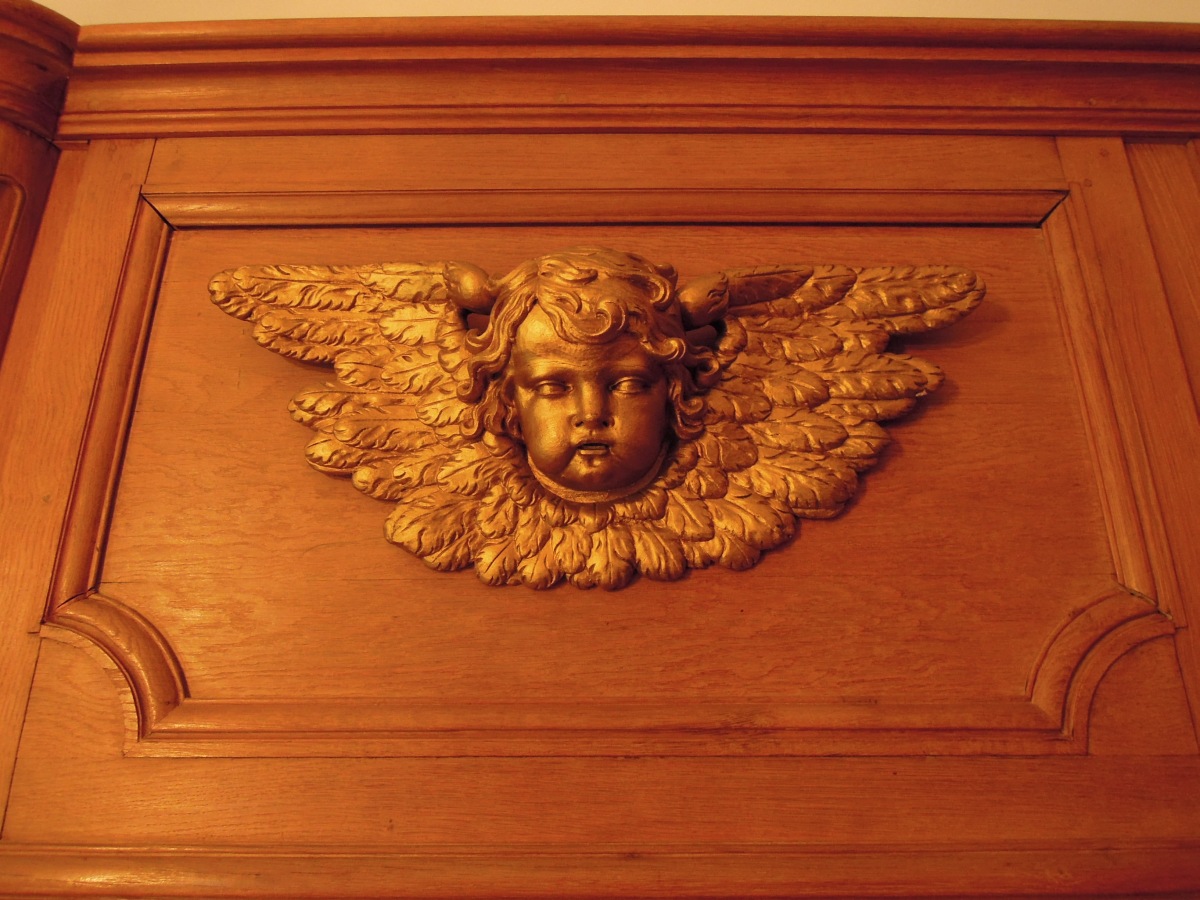 TÊTE D'ANGE bouclé dans l'entourage de ses ailes déployées, en bois sculpté et doré. Hauteur : 30, Largeur : 71 cm.