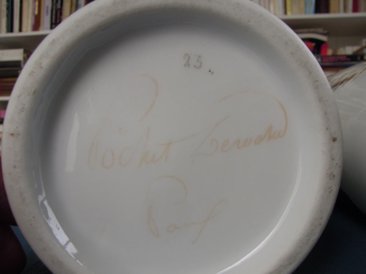 Deux POTS À PHARMACIE en porcelaine blanche à décor à l'avers de médaillons dorés et de nud violacés et marqués : "ONG. D'ARC." et "ONG. NAPOL:". Étiquette noire et or au revers du deuxième. Signés "Pochet Lerochat Paul" et numérotés "23" et 17".