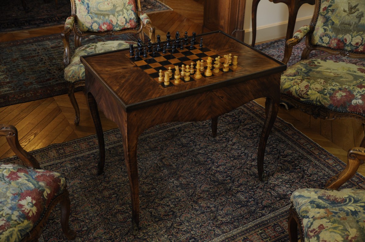 Étiquette sous le bâti  : "52784". Jeu d'échec en bois tourné.