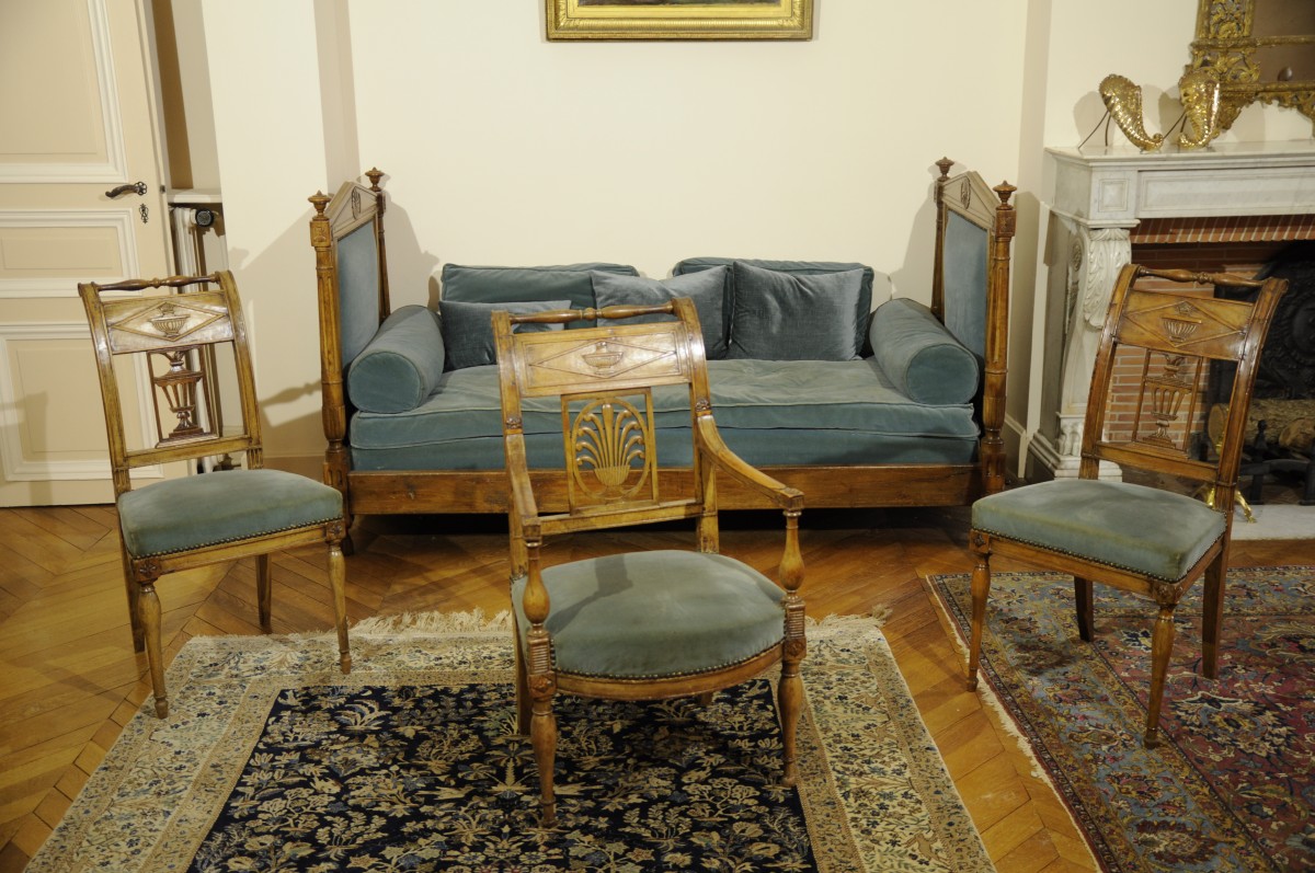 SALON en bois sculpté composé d'un LIT DE REPOS à frontons et colonnes cannelées, d'un FAUTEUIL et de deux CHAISES à dossiers ajourés de vases et de palmettes. Piétement godronné pour le lit, balustre à l'avant pour les sièges et sabre postérieurement.