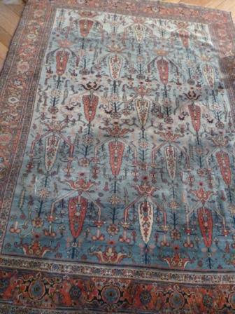 Tapis SENNEH KURDE, Nord-ouest de la Perse, première moitié du XXème. À décor de cyprès rouges et ivoire, de fleurs géométriques multicolores sur fond bleu ciel. Bordure rouge à guirlandes de fleurs cernée dune contre-bordure ivoire.