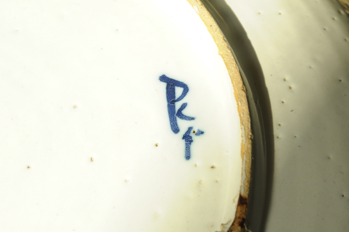 Paire de PLATS rond en faïence à décors fleuris en camaïeux de bleu. Signés "PK7". Delft, XIXème. Diamètre : 34 cm (cheveu à l'un des plats).
