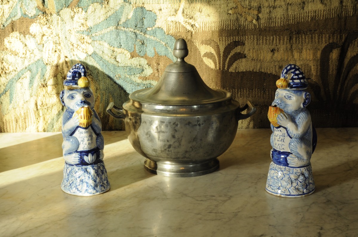 Paire de PICHETS ZOOMORPHES figurant des singes buveurs en bonnet de nuits, à décor de camaïeux de bleu. Delft. Hauteur : 22 cm.