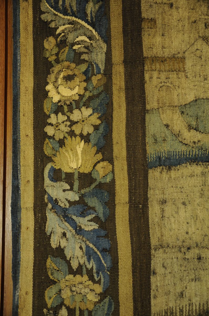 La tapisserie présente danciennes restaurations, des zones dusures et de minuscules trous dans la composition centrale.