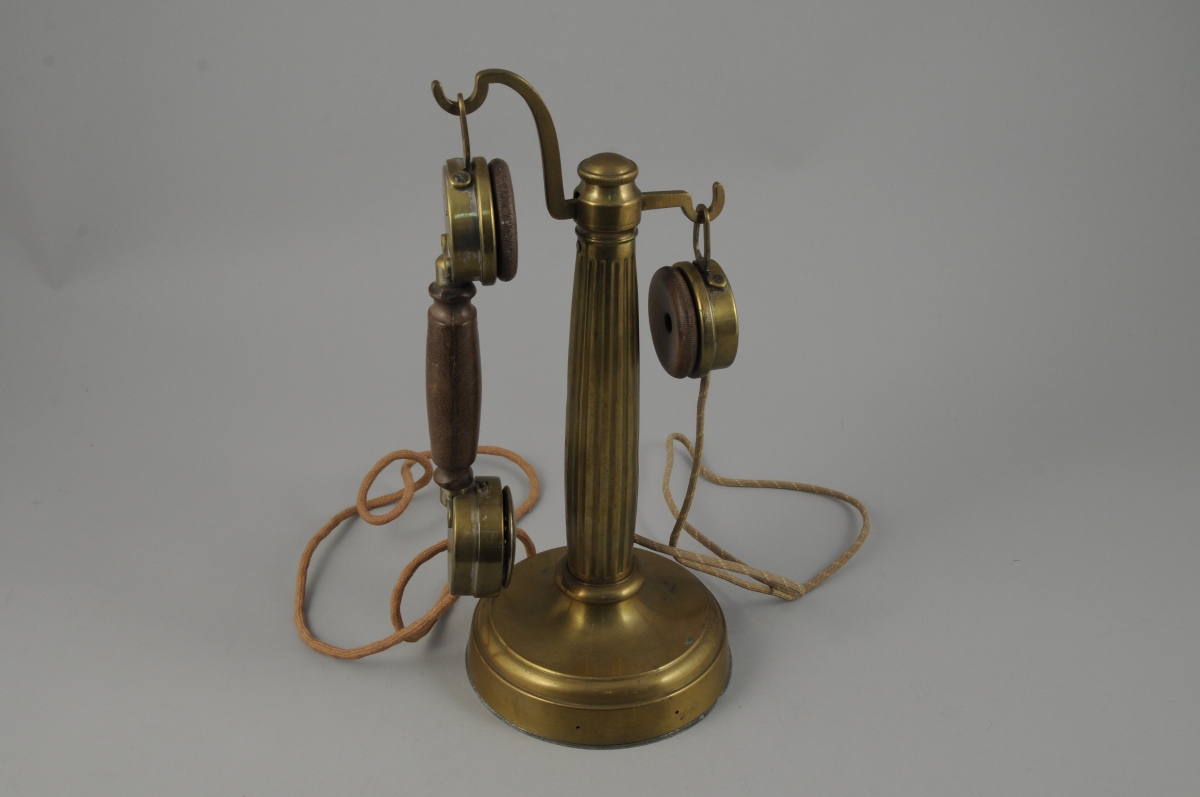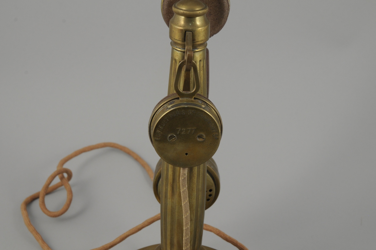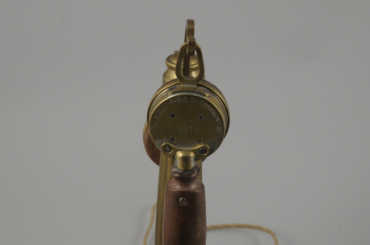 GRAMMONT. Téléphone mobile en laiton et bakélite à colonne cannelée avec combiné et écouteur. Le combiné et l'écouteur portent la marque "EURIEULT / PARIS / Ste GRAMMONT Sr" et les numéros "6919" et "7277". Début du XXème. (traces d'argenture)