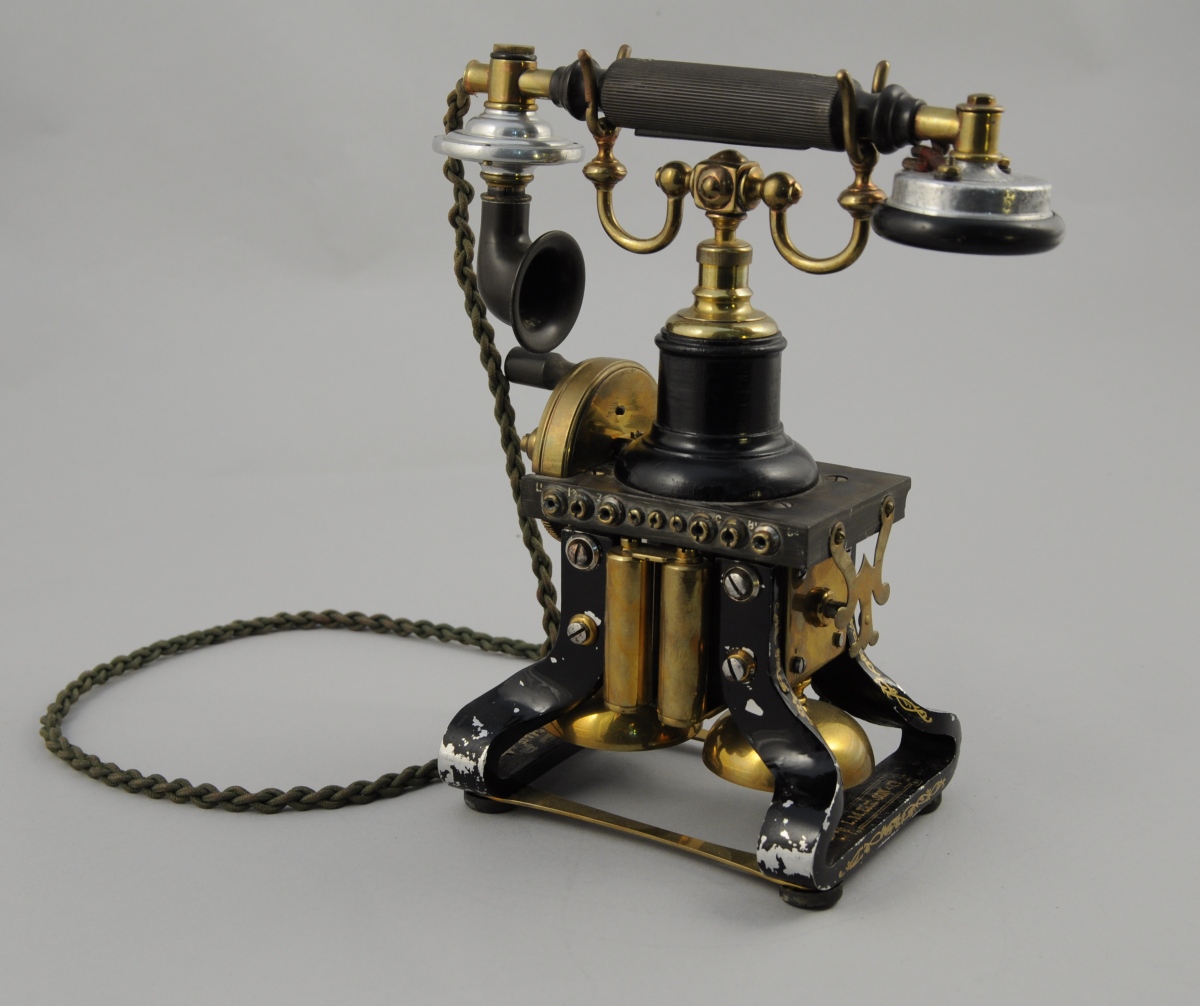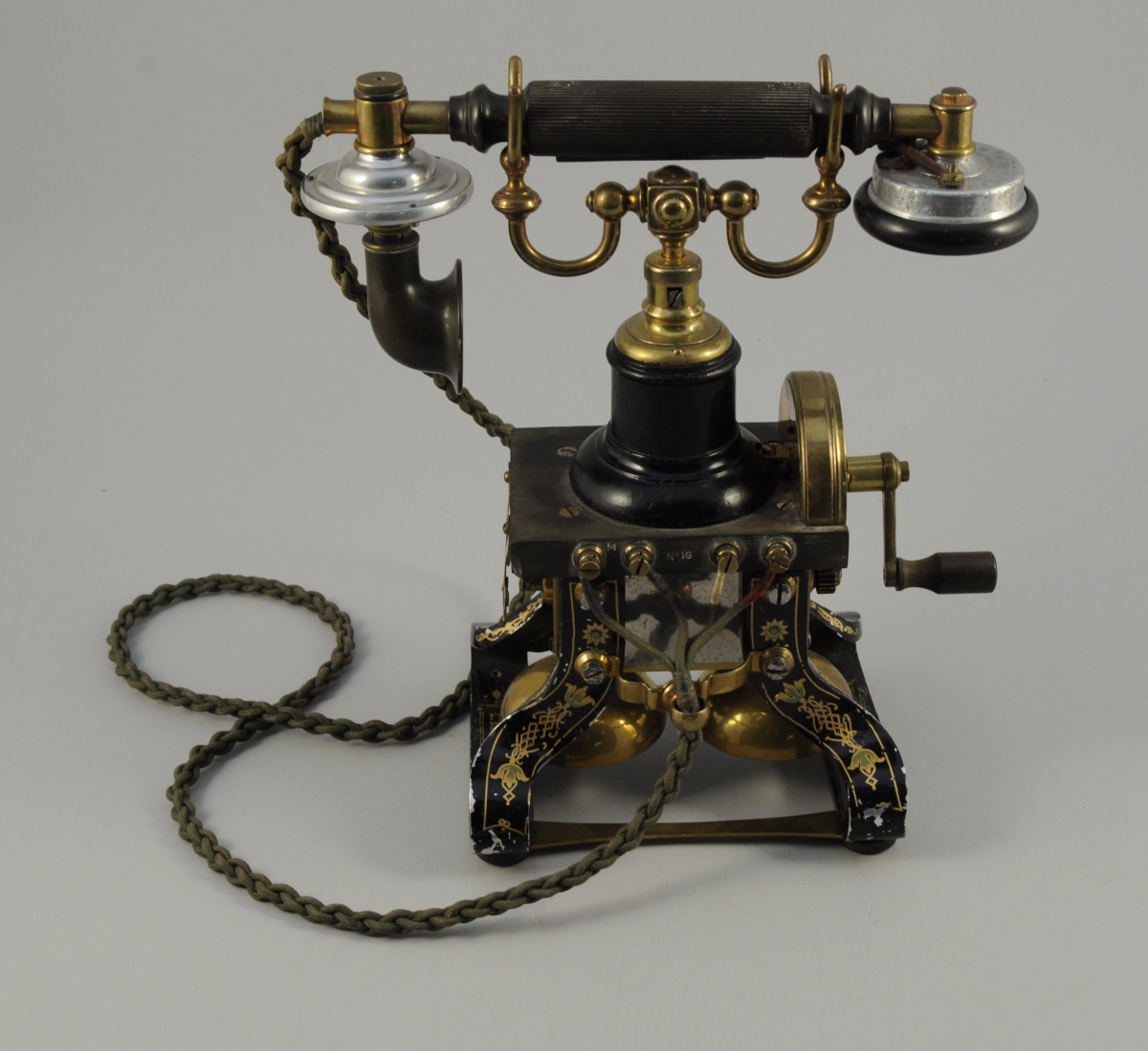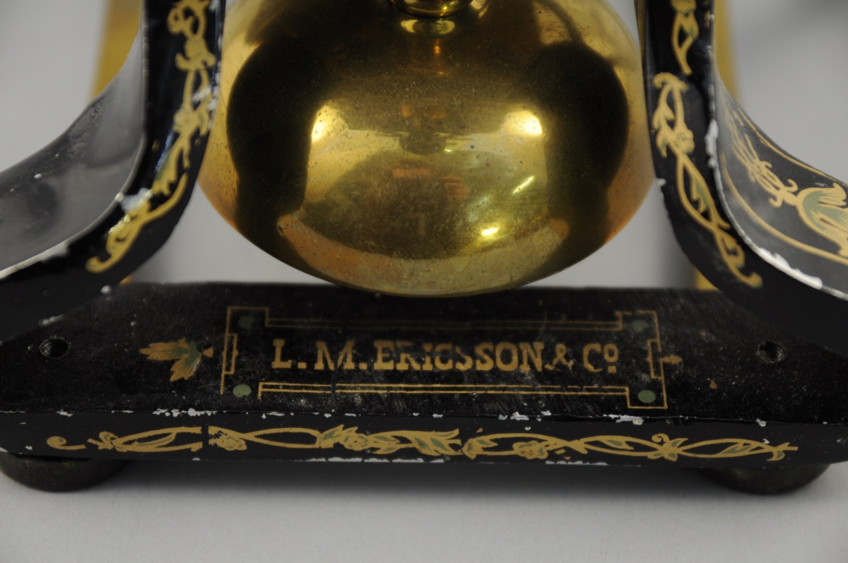 L.M. ERICSSON AND CO. Téléphone mobile dit "Machine à coudre" en métal laqué, laiton et bois peint. Piètement en métal laqué noir à décor de ferronneries vert et or. Combiné, manivelle et deux timbres de sonnerie incorporés. Modèle 1894. Marqué "L.M. ERICSSON & Co" de chaque côté du piètement. (petits manques)