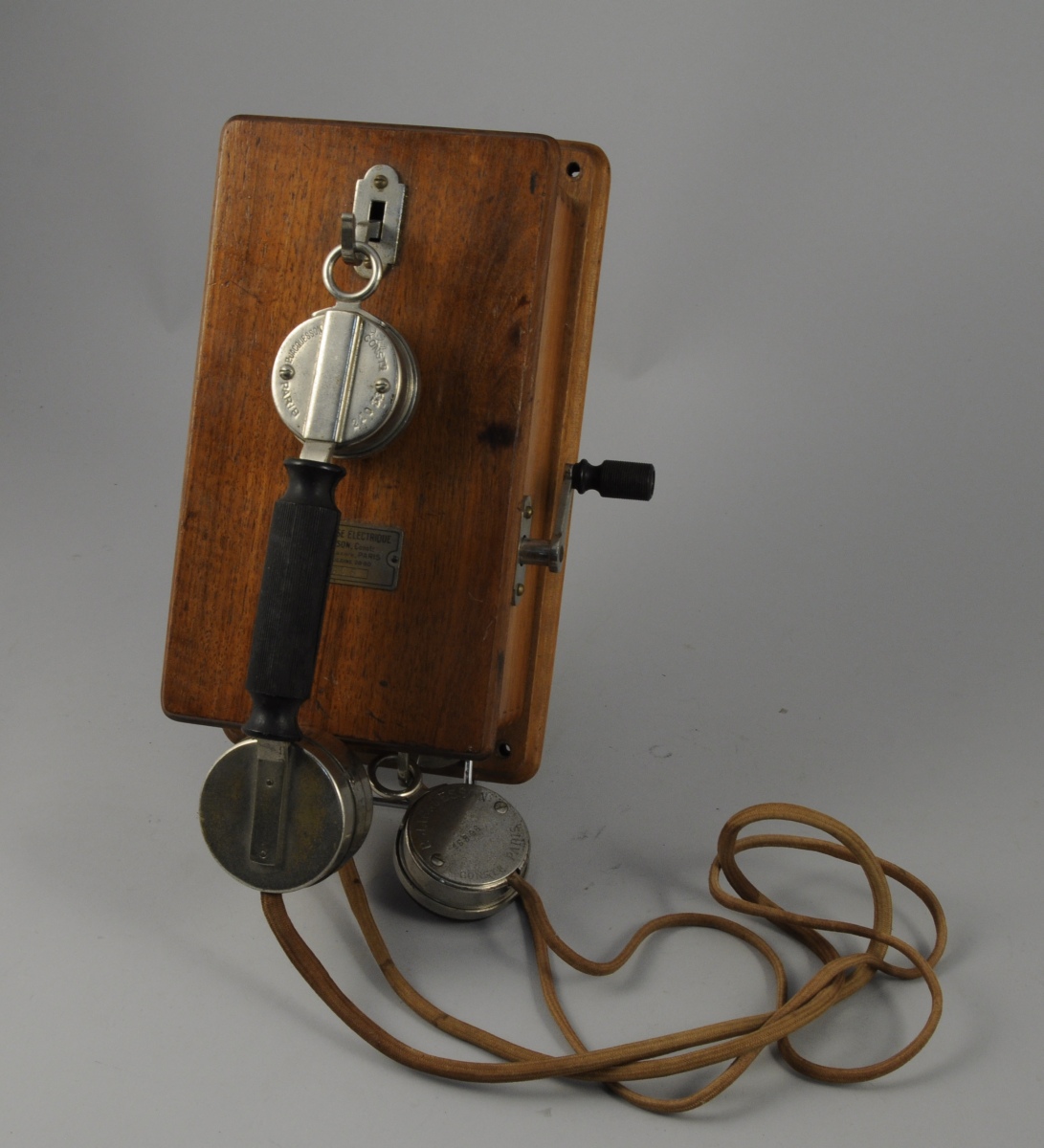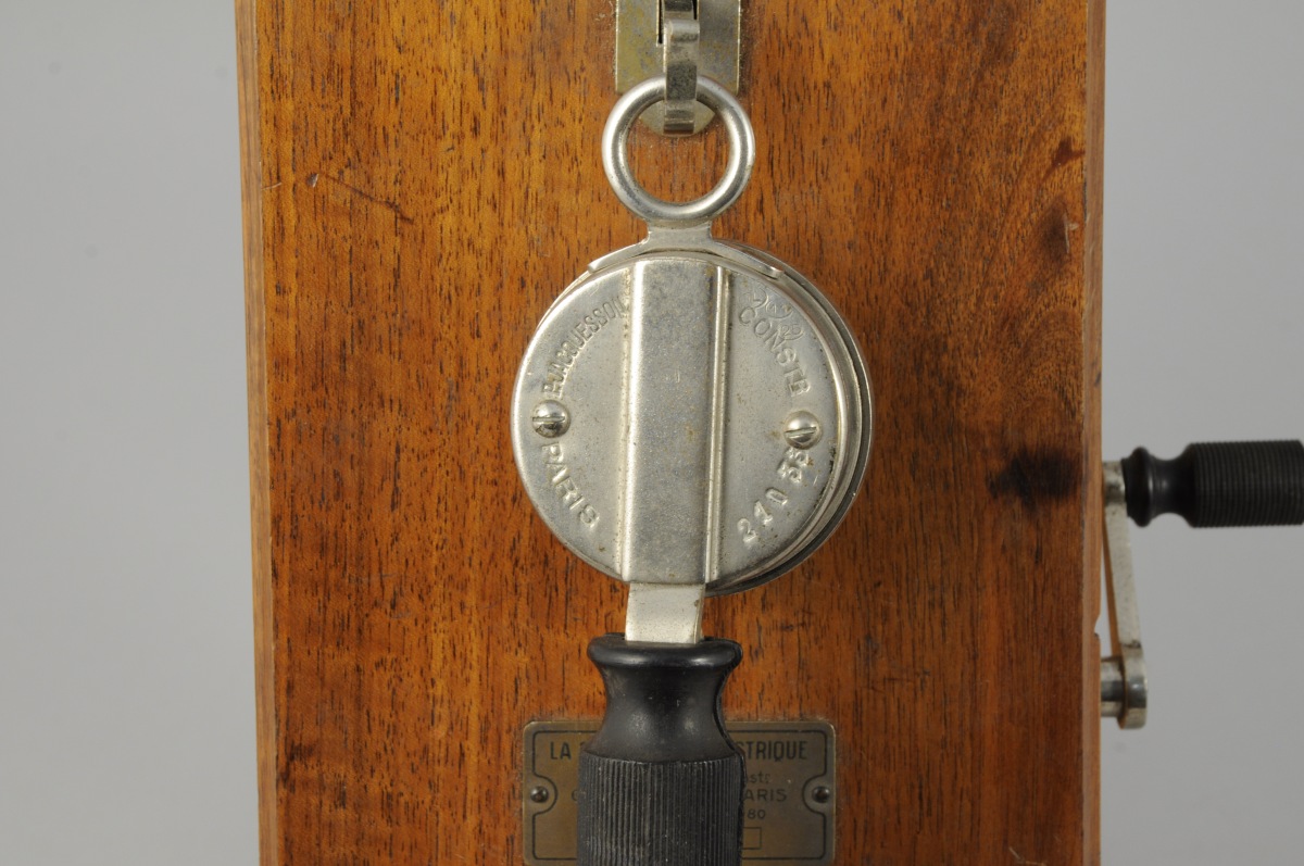 LA SÉQUANAISE ÉLECTRIQUE. Téléphone mural à caisson rectangulaire en noyer. Combiné et écouteur en métal chromé et ébonite Jacquesson. Porte une plaque en laiton marquée " La Séquanaise Électrique / P. Jacquesson, constr. 67, / 67, rue St Lazare, PARIS / Téléph : Trudaine 28-80 / N° 1605". Circa 1910. (légères usures)