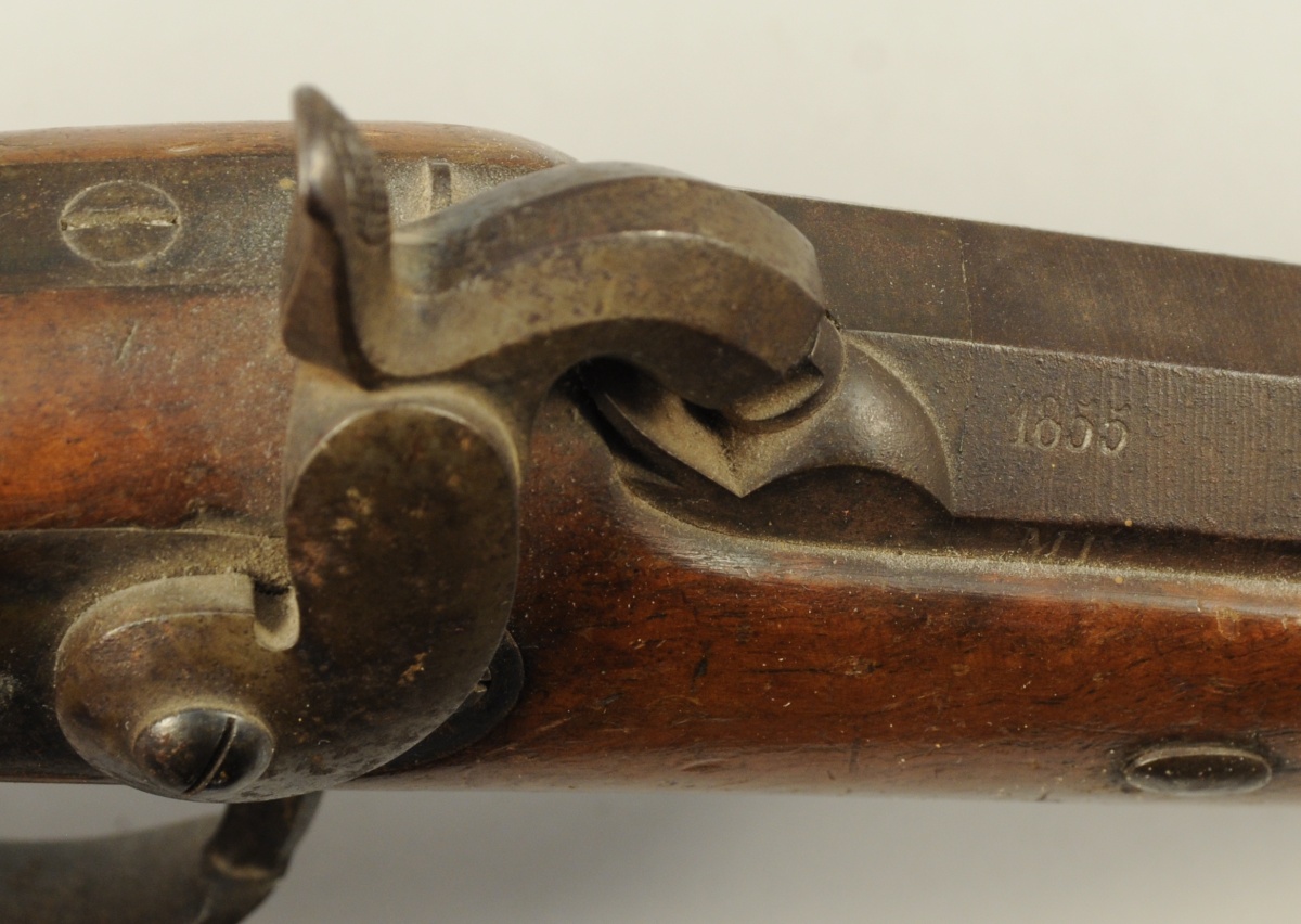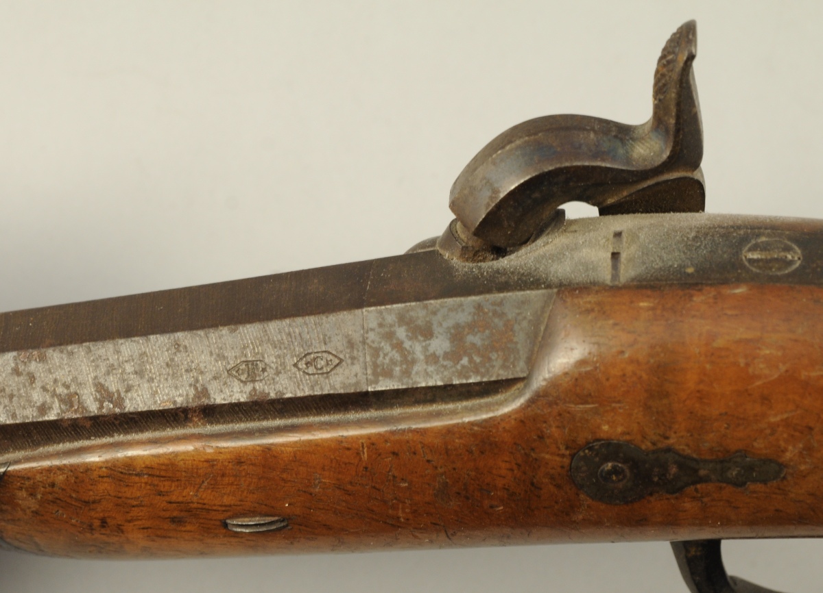 Paire de PISTOLETS D'OFFICIER à percussion, modèle réglementaire 1833, 2ème type (?), à canons octogonaux rayés et damassés. Crosses en noyer guilloché. Les platines marquées "Mre Impale de Châtellerault". Les canons marqués 1855, MI, et poiçonnés F et C. Longueur : 37 cm, Canon 22,5 cm.