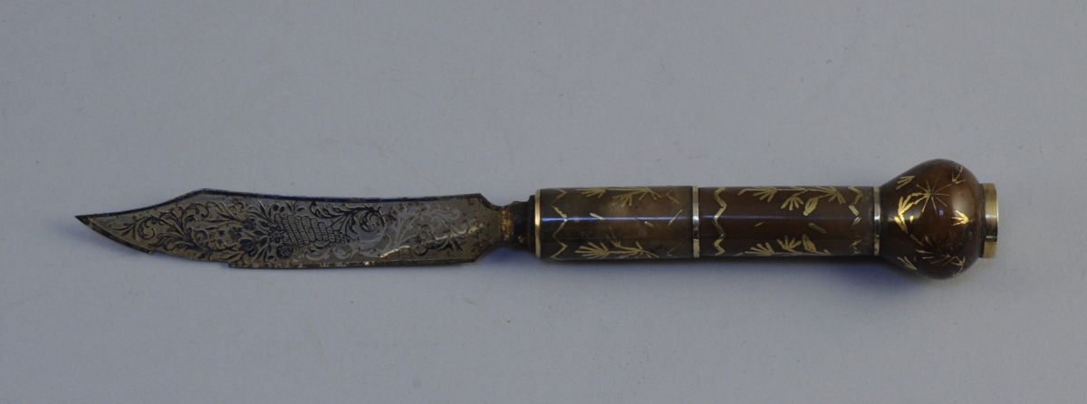Petit COUTEAU - cachet de bureau. Poignée en agate, à décor incrusté d'or, surmonté d'un cachet rond, doré, chiffré " B.C ". Lame à dos gravée sur fond doré (petit accident au fil de la lame).