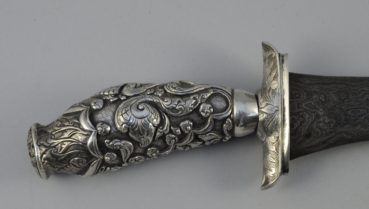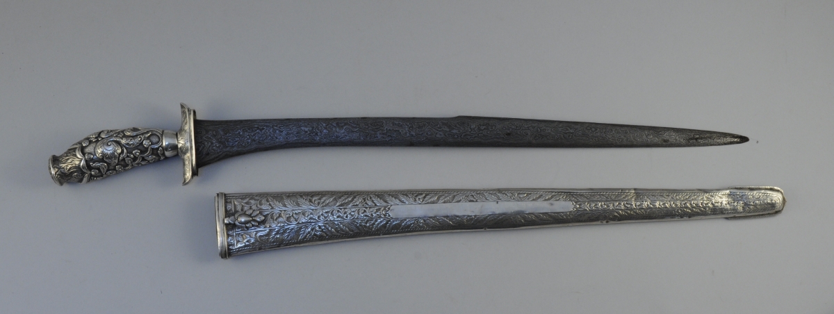 Long et beau POIGNARD dit Pedang. Poignée en argent légèrement inclinée, à décor en haut relief de feuillages et végétaux. Garde gravée à quillons légèrement relevés. Lame droite à dos et contre tranchant en acier pamor. Fourreau en bois recouvert d'argent, à décor ciselé et repoussé de feuillages.