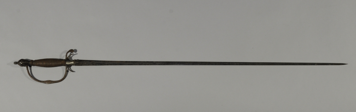 ÉPÉE DE COUR. Monture en fer à pommeau piriforme facetté. Garde à une branche, pas d'âne et quillon recourbé (manque le plateau). Fusée entièrement filigrannée de cuivre. Lame triangulaire. Seconde moitié du XVIIIème.
