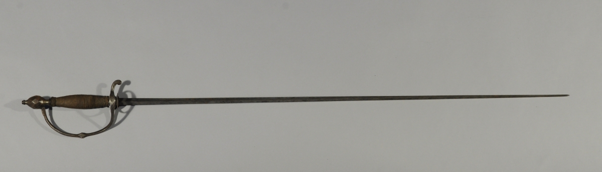 ÉPÉE. Monture en fer à une branche principale décoré au centre d'un losange et une secondaire. Anneau et pommeau facetés. Quillon recourbé. Fusée entièrement filigrannée de cuivre. Lame triangulaire. Sans fourreau.