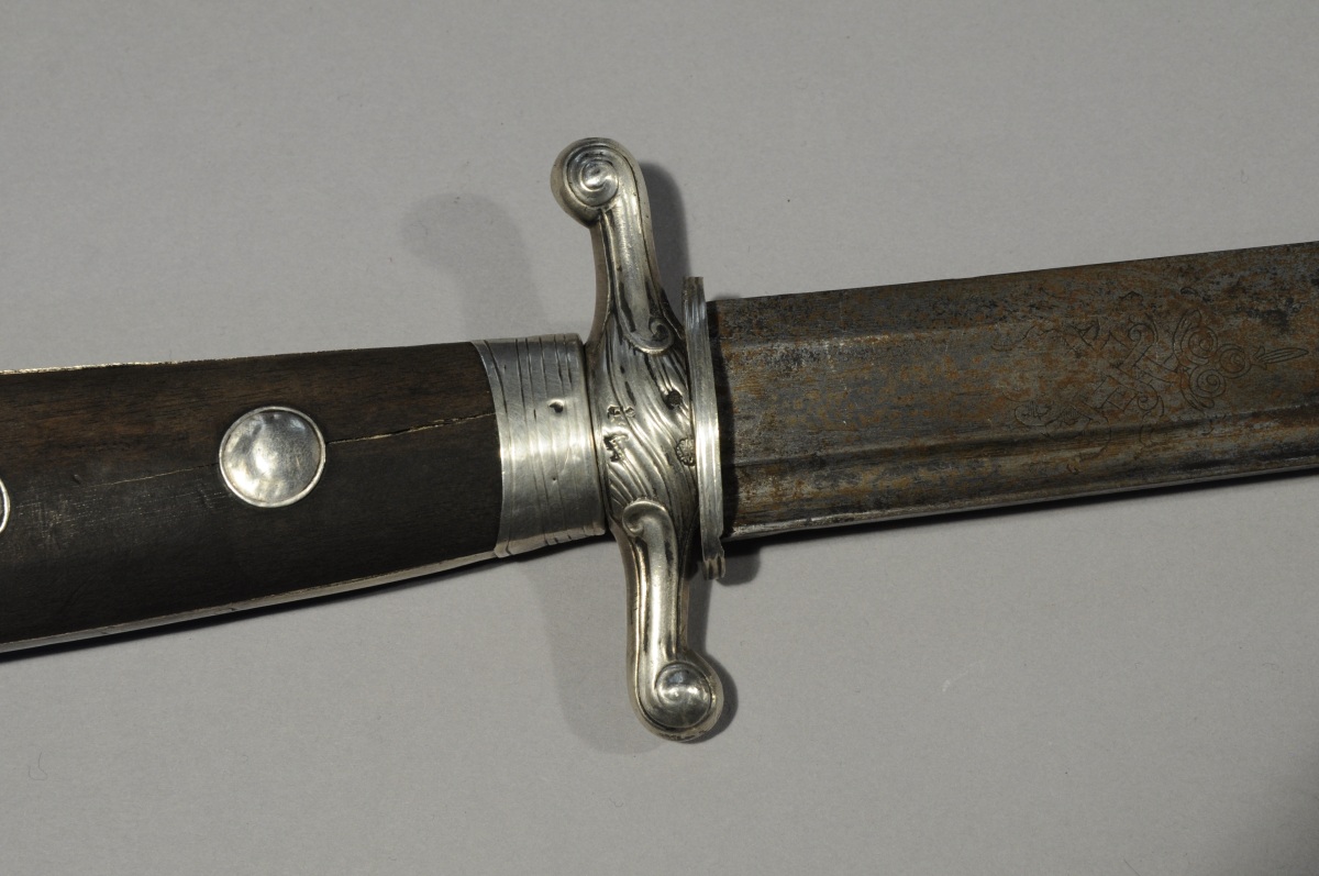 COUTEAU DE CHASSE, monture en argent. Croisière à deux quillons inversés. Poignée en crosse en ébène (fente) ornée de trois boutons d'argent. Importante lame droite à dos plat gravée d'un côté "Vive le Roy" dans un écusson fleurdelisé et de l'autre de l'écu de France couronné, d'un monogramme "CC" et d'un soleil. Poinçons aux Fermiers Généraux. Manque le fourreau.