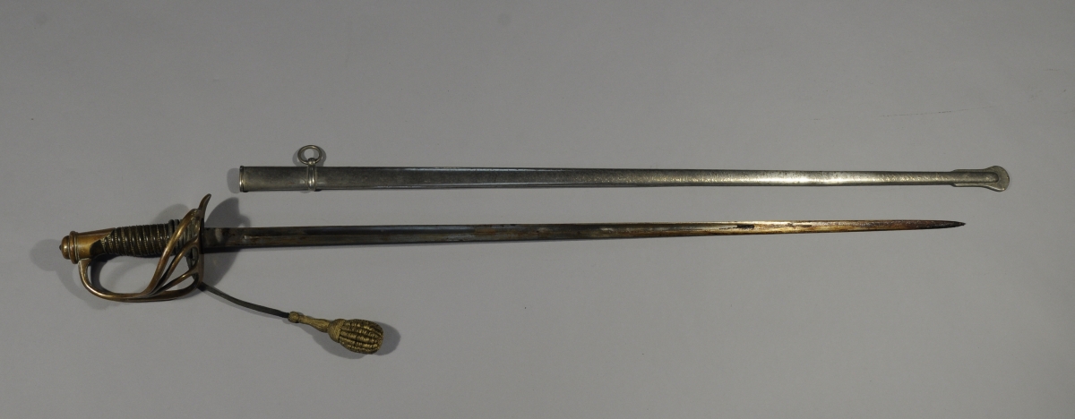 SABRE D'OFFICIER de cavalerie. Poignée en corne filigranée. Monture en laiton à une branche principale et trois secondaires. Lame droite à dos plat et forte gorge. Fourreau en tôle de fer à deux à un bracelet de bélière et un anneau. Dragonne à gland en filigranne doré.