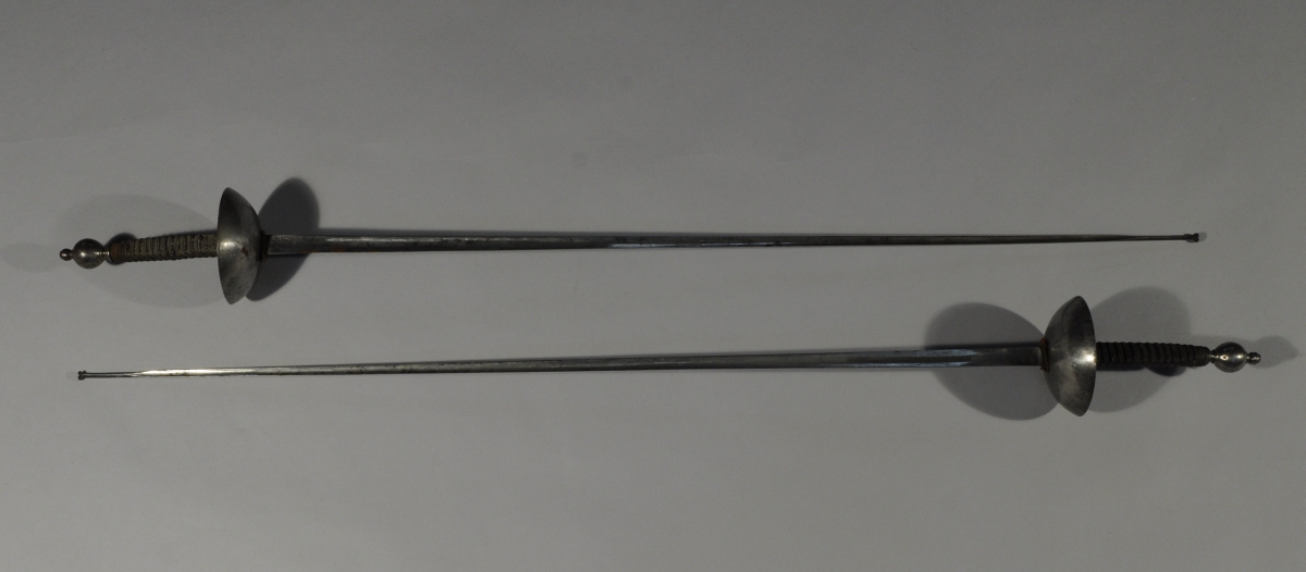 PAIRE D'ÉPÉES D'ESCRIME. Fusée en bois gaîné de cuir et filigranne. Pommeau rond à gland. Gardes à coquille en fer gravée d'un cartouche chartourné contenant le monogramme "R.B" timbré d'une couronne de baron. Lame triangulaire signée "Coulaux & Cie Klingenthal".