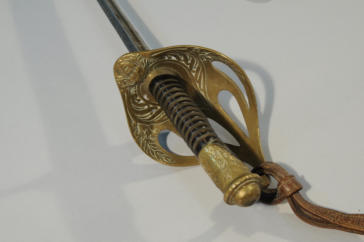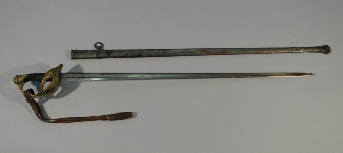 SABRE D'OFFICIER de cavalerie, modèle 1896. Poignée en corne avec filigrane. Monture en laiton ciselé. Garde à coquille à cinq branches. Pommeau monogrammé "GP" sous une couronne comtale. Lame droite à simple gorge gravée "Sabre d'Officier de Cavalerie Mle 1896 - 2ème Taille - Manufacture nationale d'armes de Châtellerault avril 1915 E". Fourreau en tôle de fer à un bracelet (oxydé). Dragonne et suspente en cuir.