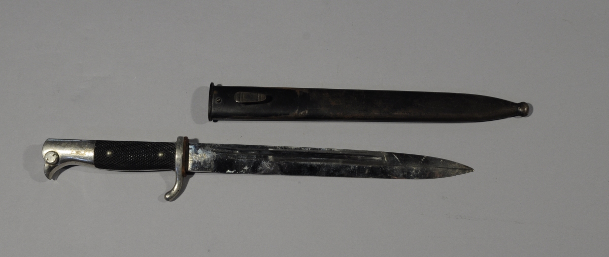 ALLEMAGNE. BAÏONNETTE de tenue de sortie, modèle 1898. Poignée en métal nickelé à plaquettes d'ébonite guillochée. Un quillon recourbé. Marquée au talon "WKC". Fourreau en métal laqué noir (oxydations).