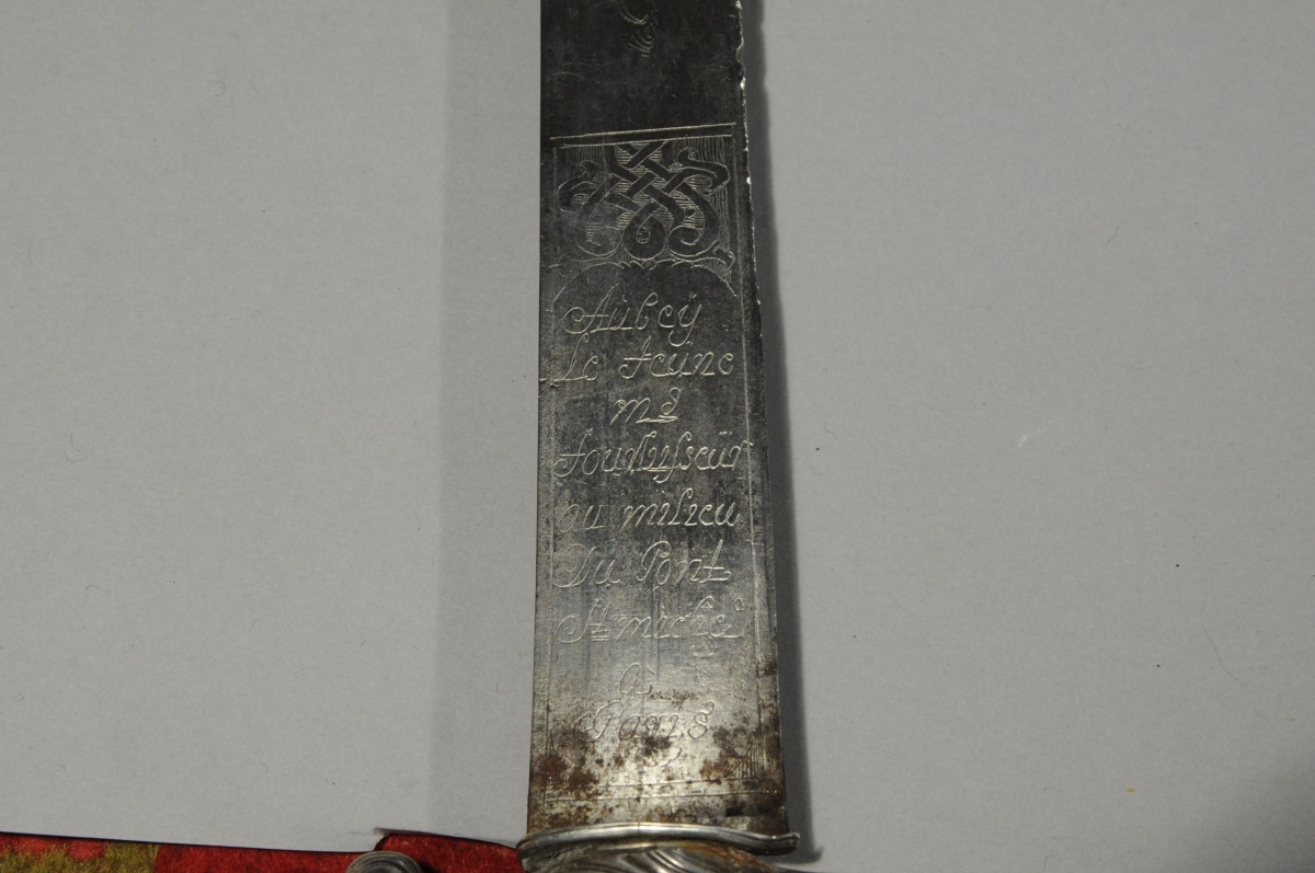 COUTEAU DE CHASSE, monture en argent, poinçons aux Fermiers Généraux. Croisière à deux quillons inversés, calotte à motif de godrons rayonnants. Poignée en ébène. Lame légèrement courbe à dos plat gravée d'un chien pourchassant, d'un côté un cerf et de l'autre un sanglier. Signée "Aubey Le Jeune / Mt Fourbisseur au milieu Du Pont St Michel à Paris". XVIIIème. Fourreau rapporté en cuir noir, chappe en laiton (manques le pontet), bouterolle absente.