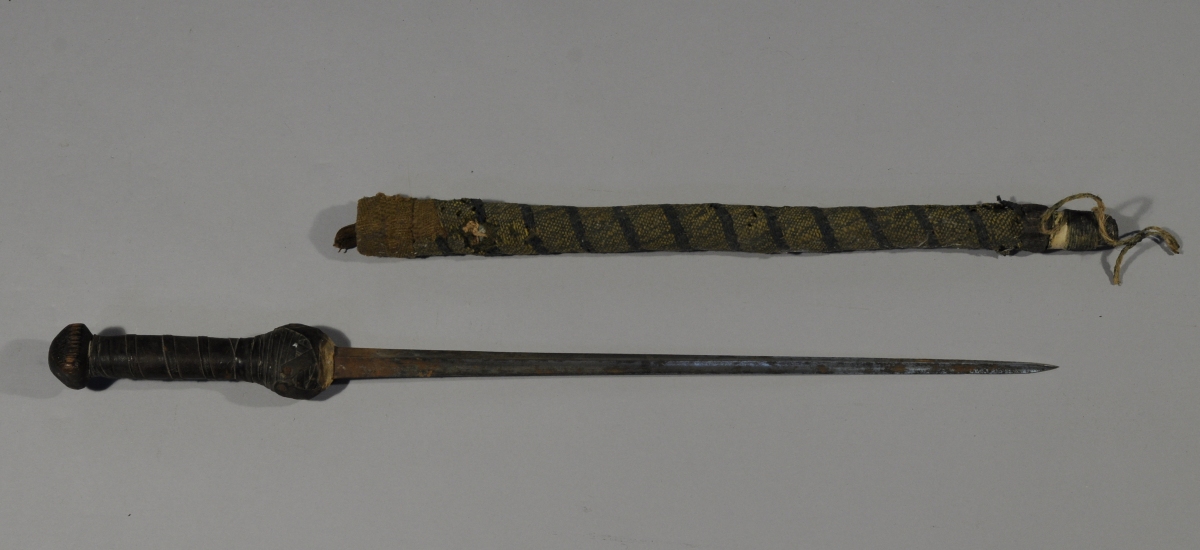 DAGUE. Poignée de bois gaînée de lanières de cuir brun. Pommeau en bois de forme pyramidale. Lame triangulaire constituée probablement à partir d'une lame d'épée brisée et retaillée. Fourreau fait de multiples couches de tissu.