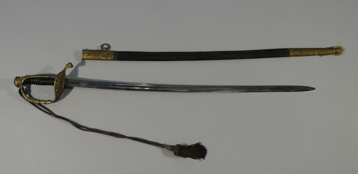 SABRE D'OFFICIER DE MARINE, modèle 1837. Poignée en corne. Monture en laiton ciselé. Lame légèrement cintrée, contre-tranchant signé "Coulaux & Cie Klingenthal". Fourreau en cuir, à deux garnitures en laiton. Chape ornée de l'ancre. Dard à coquille. Dragonne en cannetille anciennement dorée.