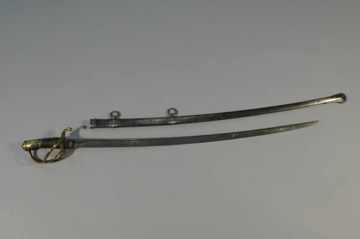 SABRE DE CAVALERIE LÉGÈRE troupe modèle 1816. Poignée recouverte de basane avec filigrane. Monture en laiton. Garde à trois branches à quillon courbe avec matricule. Lame courbe à dos rond et contre tranchant, poinçonnée au talon "L" pour Lobstein (Réviseur à Klingenthal) et signée "Manufre Rale de ? Aout 1819". Fourreau en tôle de fer à deux bracelets et deux anneaux.