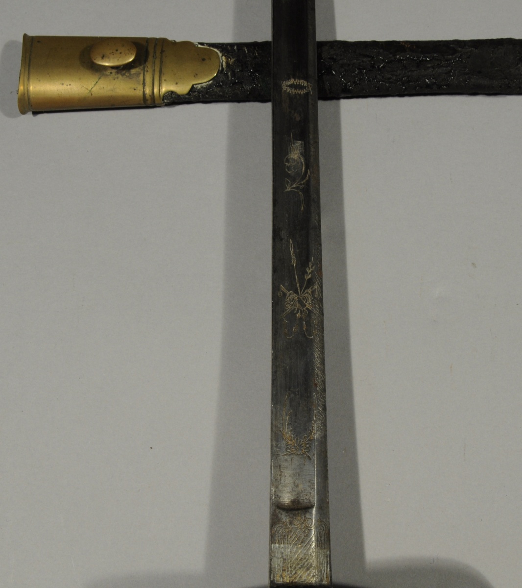 ÉPÉE D'UNIFORME, premier modèle. Plateau en lyre asymétrique avec cannelures sur le pourtour et quillon en palmette. Quillons droits quadrangulaires, fusée filigranée de métal et pommeau au casque empanaché du modèle d'officier d'état-major Vendémiaire, lame à dos plat ciselée au tiers de feuillages stylisés et trophées d'armes. Fourreau en cuir à deux garnitures en laiton. Pontet olive. Premier Empire.