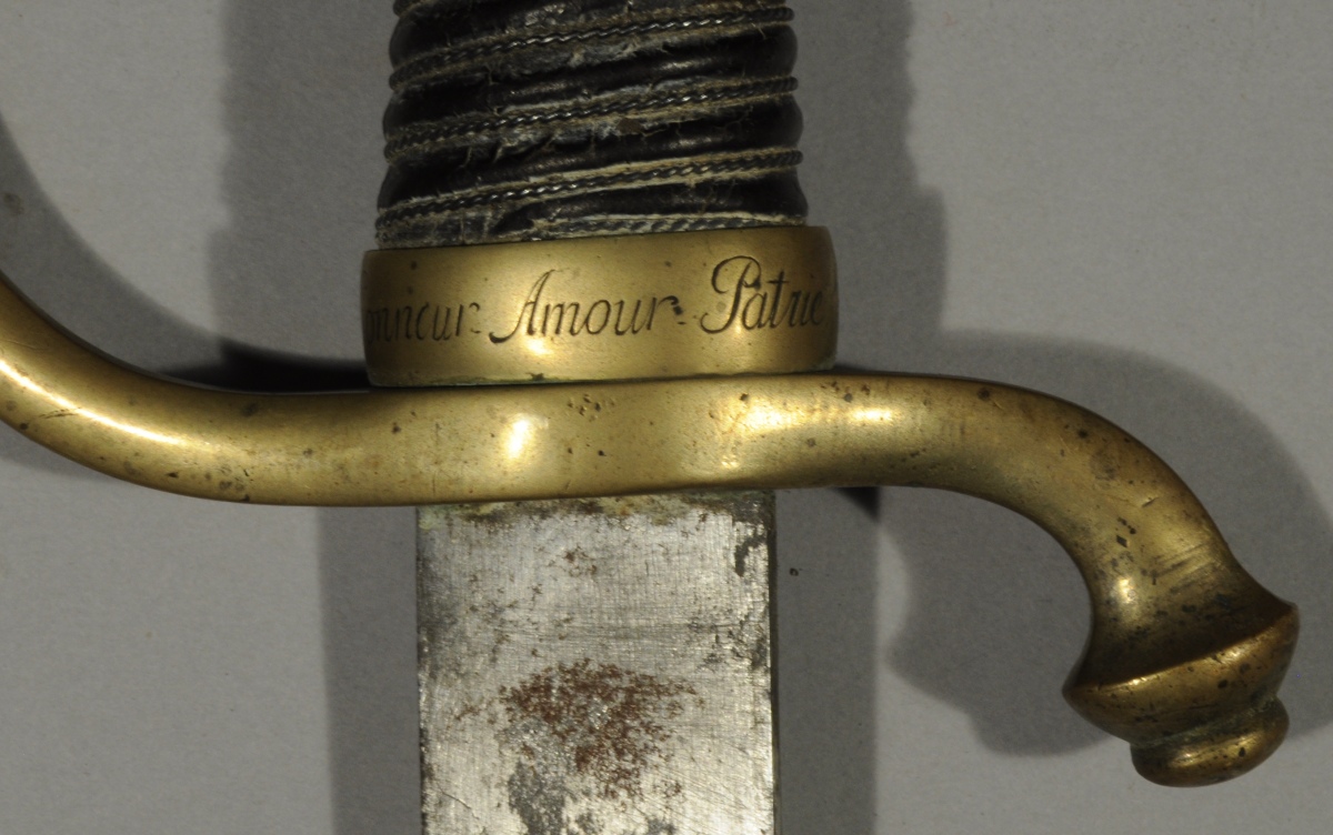 SABRE. Poignée gaînée de basane filigrannée. Monture en laiton gravée Honneur / Amour / Patrie / B. Tr". Branche simple et quillon recourbé. Lame courbe à dos plat ciselée en son centre de volutes dorées. Fourreau en cuir noir à deux garnitures de laiton.