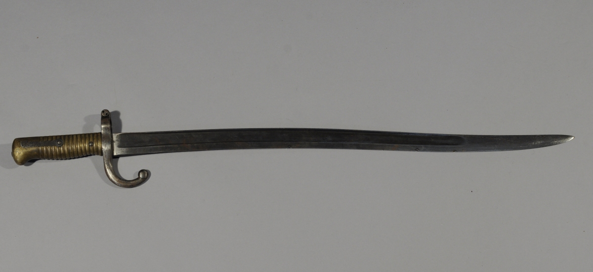 BAÏONETTE CHASSEPOT modèle 1866. Poignée en laiton. Croisière en fer avec numéro de matricule. Lame frappée d'une croix de Malte (fabrication anglaise ou belge). Sans fourreau.