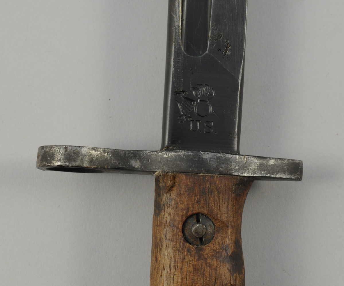 ÉTATS-UNIS D'AMÉRIQUE. BAÏONNETTE REMINGTON, modèle 1917. Monture en métal noirci et fusée à plaquettes de bois. Lame droite en acier noirci à dos arrondi et large gorge marquée au talon "1917 Remington", "US"et frappée de la tête d'aigle, de la grenade et du chiffre 26. Fourreau syntétique vert kaki et chappe en métal marquée US-M1917 / B.M.CO.