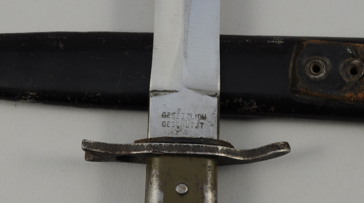 ALLEMAGNE. BAÏONNETTE ERSATZ, modèle 1916. Poignée laquée vert Felgrau (manques). Lame à double tranchant marquée au talon "Demag / Duisbourg" d'un côté et "Gesetzlioh / Geschüzt" de l'autre. Fourreau en tôle de fer laqué noir avec porte- fourreau en cuir noir.