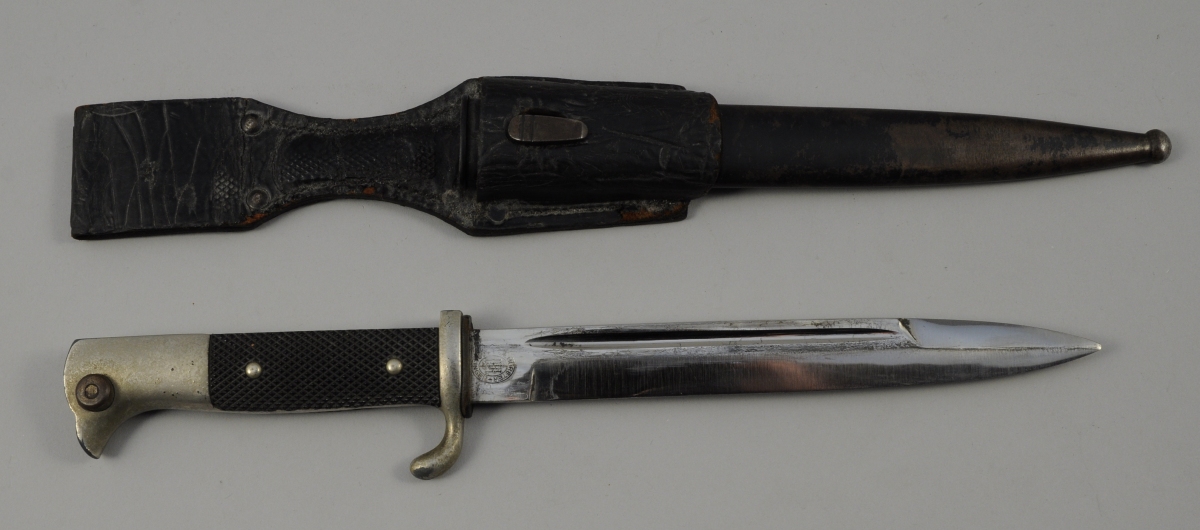 ALLEMAGNE. BAÏONNETTE de tenue de sortie, modèle 1898. Poignée en métal nickelé à plaquettes d'ébonite guillochée. Un quillon recourbé. Marquée au talon "Hörster Solingen". Fourreau en métal laqué noir (oxydations). Étui en cuir noir.