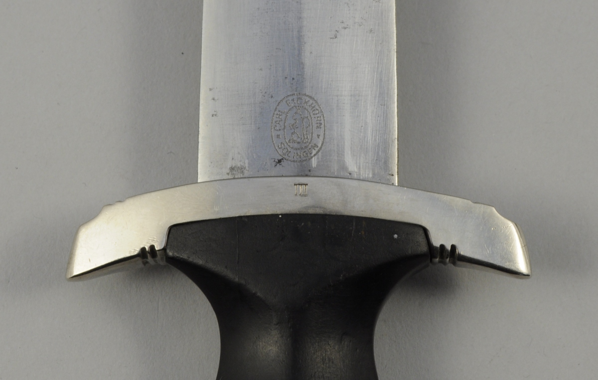 DAGUE DE PARADE. Poignée de forme chantournée, monture en métal, fusée en ébonite. Lame droite à double tranchant. Fourreau en métal patiné à deux garnitures en métal. Attache de ceinturon en cuir à garnitures de métal.