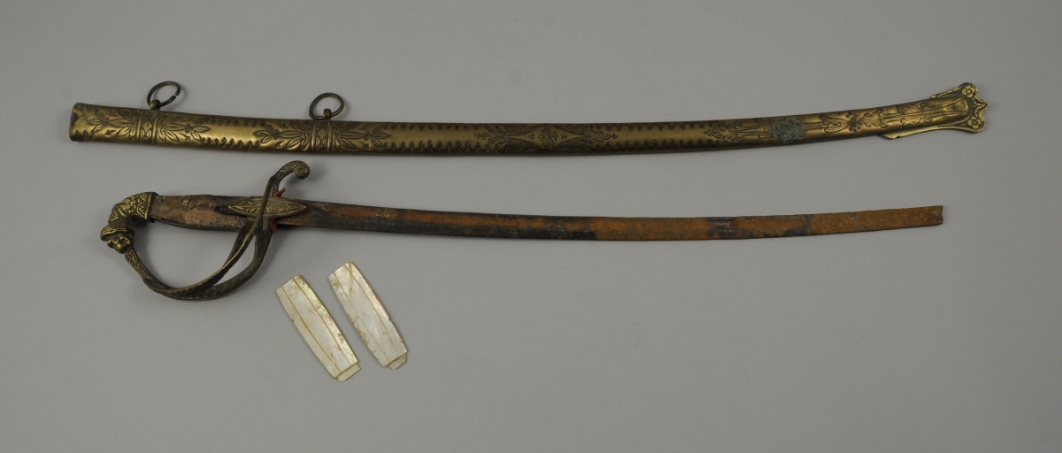 MODÈLE D'OFFICIER DE CAVALERIE. Monture en laiton, garde à la chasseur à trois branches unies (bris). Décor de branches de laurier et palmettes. Poignée crosse à tête de lion. Lame courbe à dos plat (brisée, oxydation). Fourreau en laiton repoussé d'un riche décor de feuillages stylisés à deux anneaux de bélières.