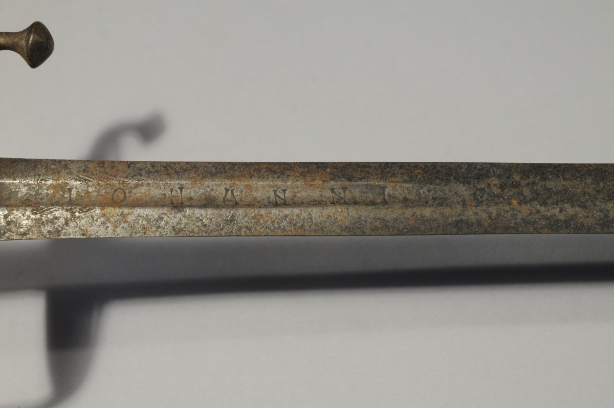 WALLONNE DE CAVALERIE. Monture fer à une branche à boules et quillon recourbé. Pontat à grille perforée et pièce de pouce. Fusée entièrement filigranée. Lame de Solingen à double tranchant et gorge centrale au talon signée IOHANNI. Sans fourreau.