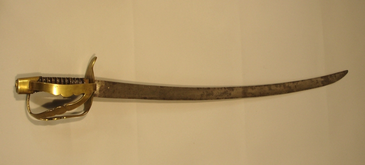 SABRE DE CHASSEUR À CHEVAL troupe modèle 1790. Poignée recouverte de basane avec filigrane. Monture en laiton. Garde à trois branches. Poinçonnée au coq et marquée "LEMAITRE". Lame courbe à dos plat, poinçonnée du faisceau de licteur.