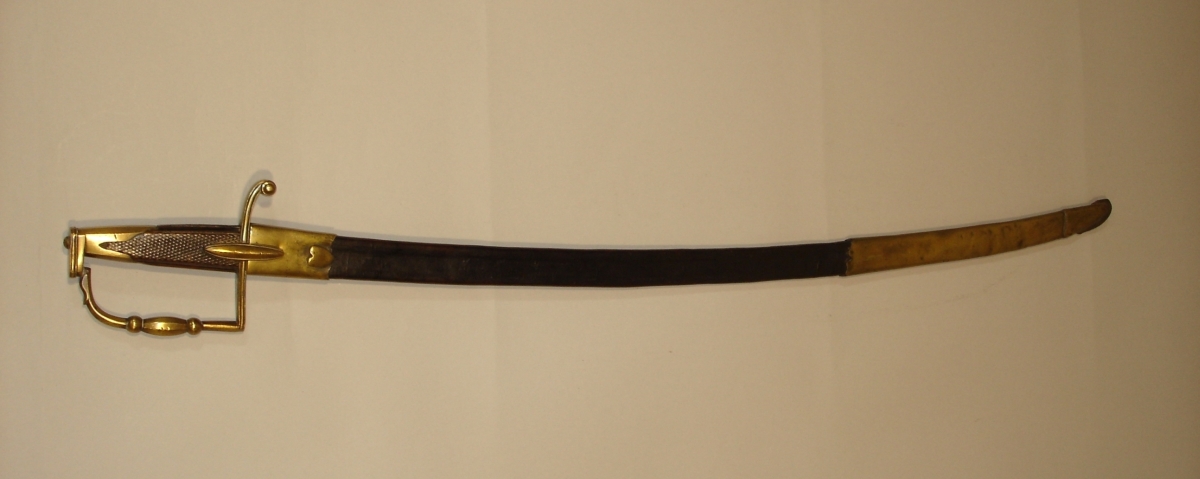 SABRE D'OFFICIER D'INFANTERIE. Monture en laiton à l'allemande. Poignée en ébène à quadrillage en losange. Garde à une branche taillée à facettes au centre, à deux oreillons en navette et quillon enroulé. Lame courbe, à dos plat, contre-tranchant et pans creux, gravée au tiers de feuillages et attributs militaires. Fourreau en cuir à deux garnitures en laiton découpé. (réparations à la bouterole). Dard en fer.