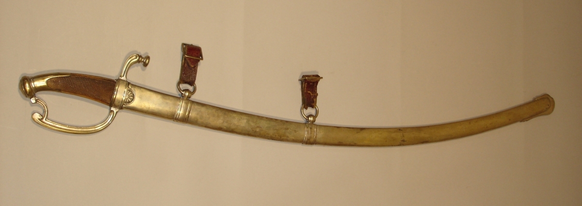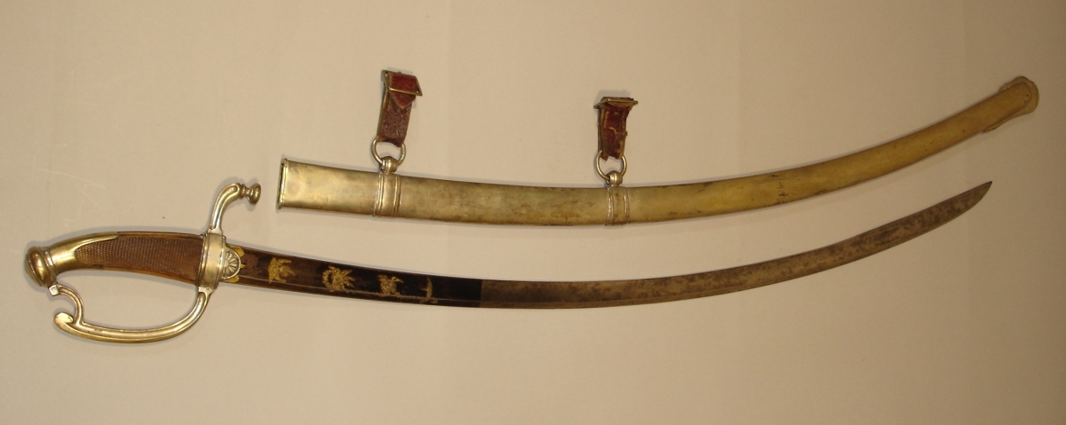 SABRE D'OFFICIER DE CAVALERIE LÉGÈRE. Monture en laiton argenté. Poignée en ébène à quadrillage en losange. Garde à une branche, à deux demi-oreillons ciselés de palmettes et quillon en cachet. Lame courbe à dos plat, contre-tranchant, gouttière et pans creux, gravée, dorée et bleuie au tiers de feuillages et attributs militaires, marquée " IGB " au talon. Fourreau en laiton argenté, à deux bracelets, deux anneaux et deux attentes en maroquin.
