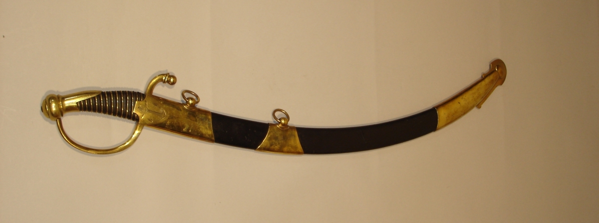 SABRE DE MARINE DE LA GENDARMERIE DES PORTS au modèle DES MARINS DE LA GARDE IMPÉRIALE. Poignée recouverte de basane avec filigrane. Calotte gravée d'un cordage. Garde à une branche évidée et deux oreillons en écu, gravés d'une ancre sur les deux faces. Quillon recourbé en boulet. Lame courbe, à dos rond, contre-tranchant, pans creux. Fourreau en bois recouvert de cuir à trois garnitures en laiton et deux anneaux de suspense.