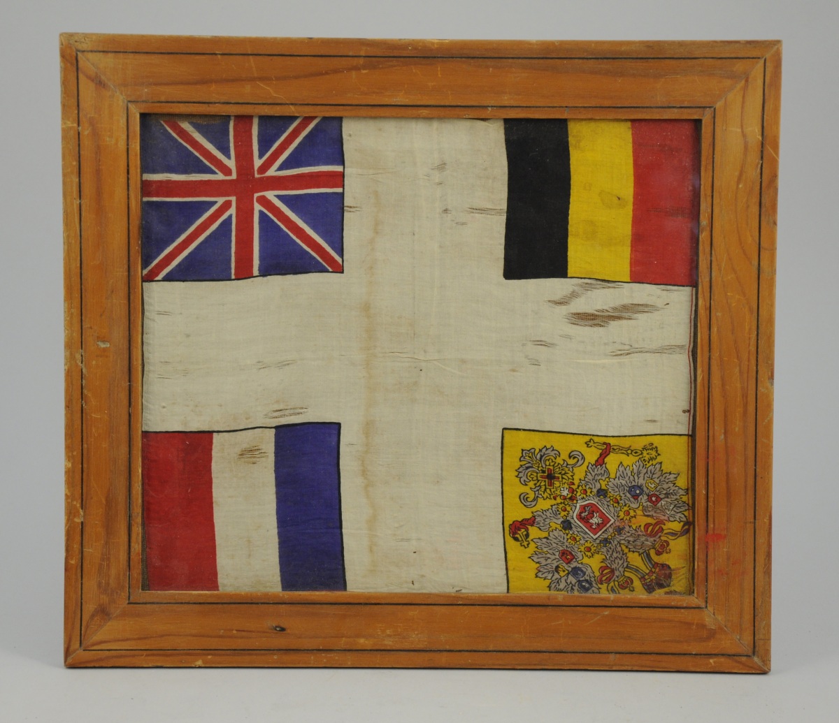 MOUCHOIR EN SOIE, souvenir de la guerre 1914/1918. Sur un fond blanc, il présente à ses quatre angles les drapeaux du Royaume-Uni, de la Belgique, de l'Empire de Russie et de la France.