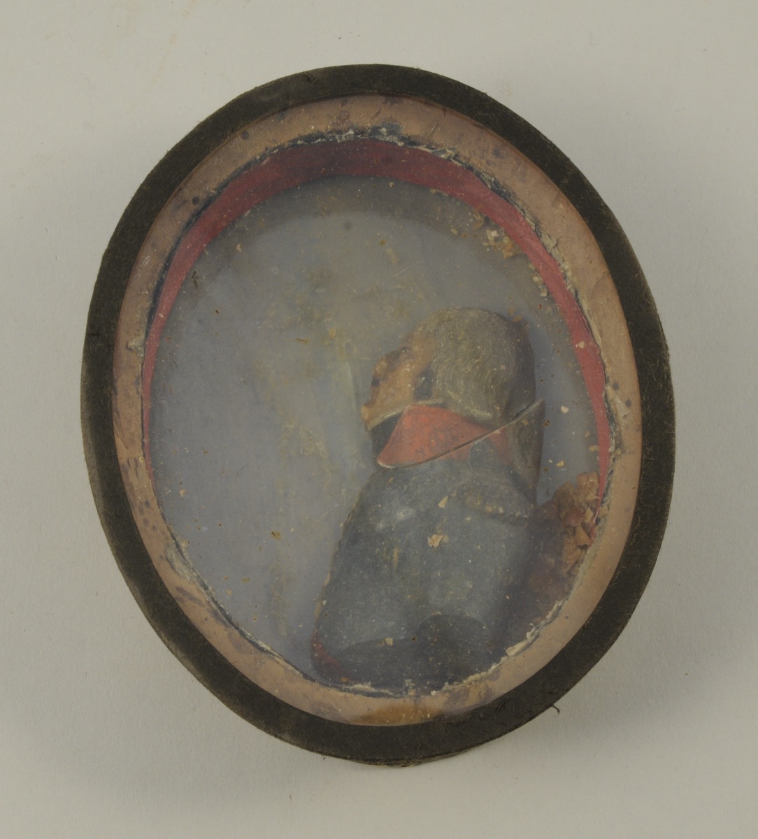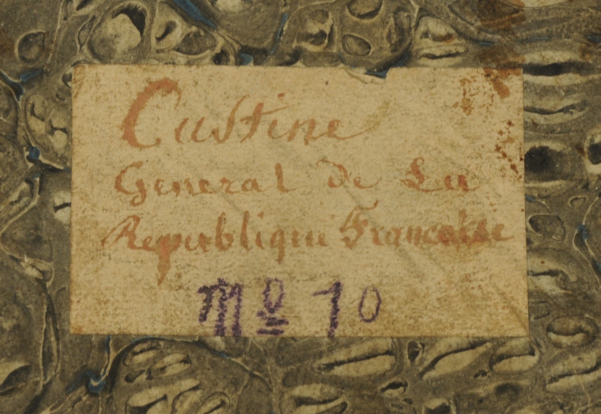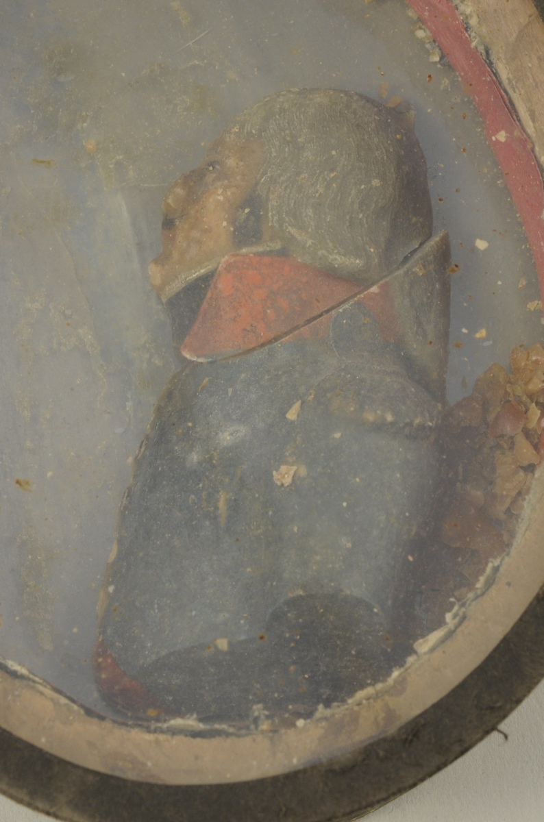 DEMI-BUSTE EN CIRE polychrome figurant de profil le général Custine. Dans un encadrement de forme ovale. Au dos, ancienne étiquette portant l'inscription manuscrite à l'encre : "Custine / Général de La République Française"