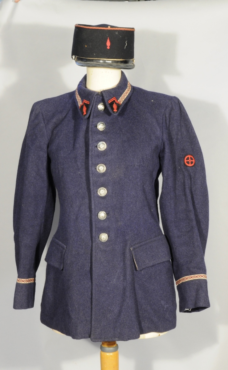 TROIS VESTES DE SAPEUR-POMPIER. La première en tissu bleu avec insignes de col à la grenade (avec son pantalon à liseré rouge), les deux autres en feutre bleu à galons rouges et galons bleu blanc rouge à frise de losanges et insignes de col à la grenade. Cousues d'une étiquette "Tailleur / À la Belle Jardinière / Mon Godard & Cie / Blois".