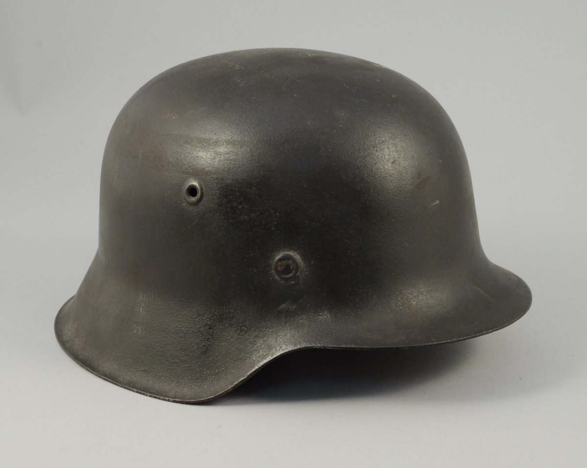 ALLEMAGNE, CASQUE modèle 1942. Peinture gris/vert mate. Insigne à l'aigle (dénazifié) sur le côté gauche. Coiffe et jugulaire (manques). Tampon de réception au fond de la coque illisible. Marqué "ck ISP / 3S5".