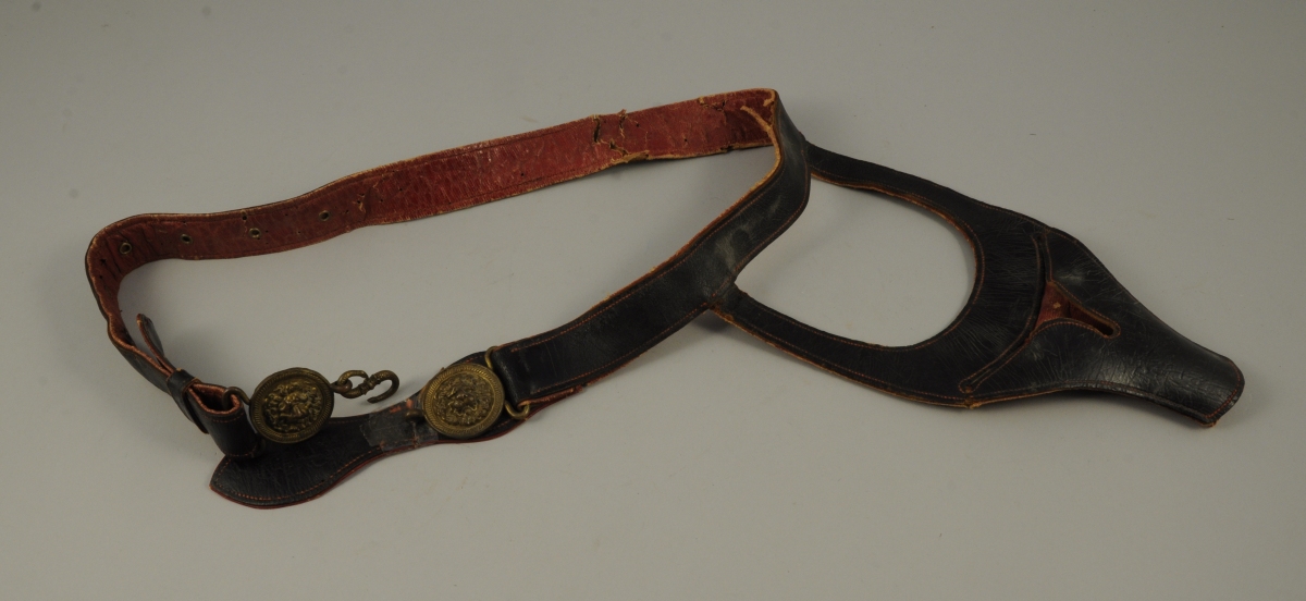 CEINTURON PORTE-ÉPÉE en cuir noir et maroquin rouge au revers. Boucles au mufle de lion en laiton. Attache en "S" à la tête d'aigle.