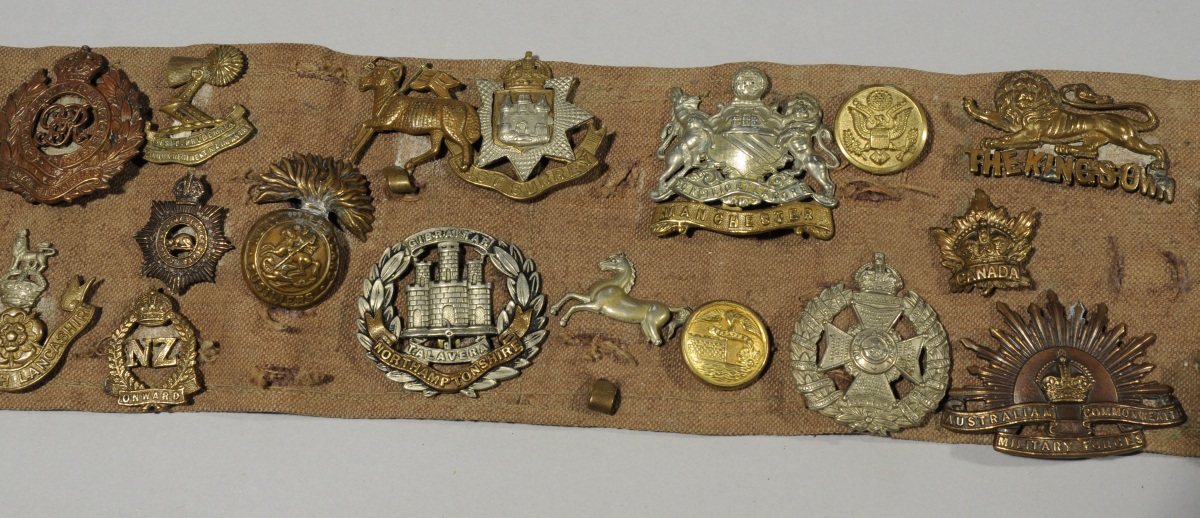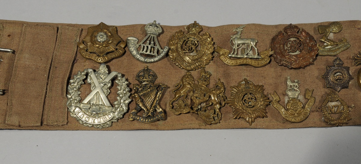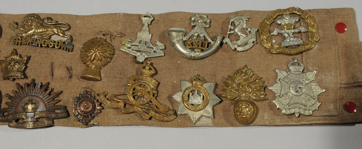 COLLECTION de 35 INSIGNES ou BOUTONS de régiments du Royaume-Uni, des États-Unis d'Amérique et du Commonwealth tels que : Manchester, East Surrey, South Lancashire, East Yorkshire, Cameron, Canadian Army Service Corps, 3rd (Auck) Regiment. N.Z. Infantry, Northumberland Fusiliers...