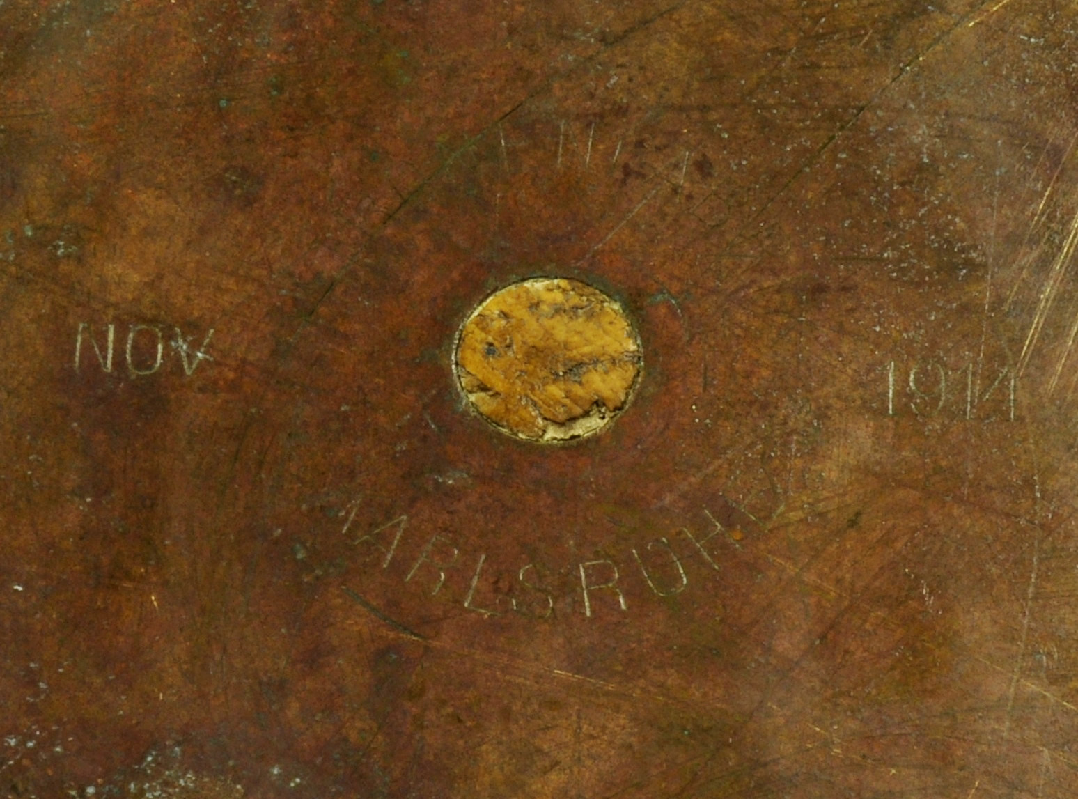 Douille d'obus de LA GROSSE BERTHA. (partie). Inscriptions : Karlsruhe nov 1914. Tronen Fabrik.