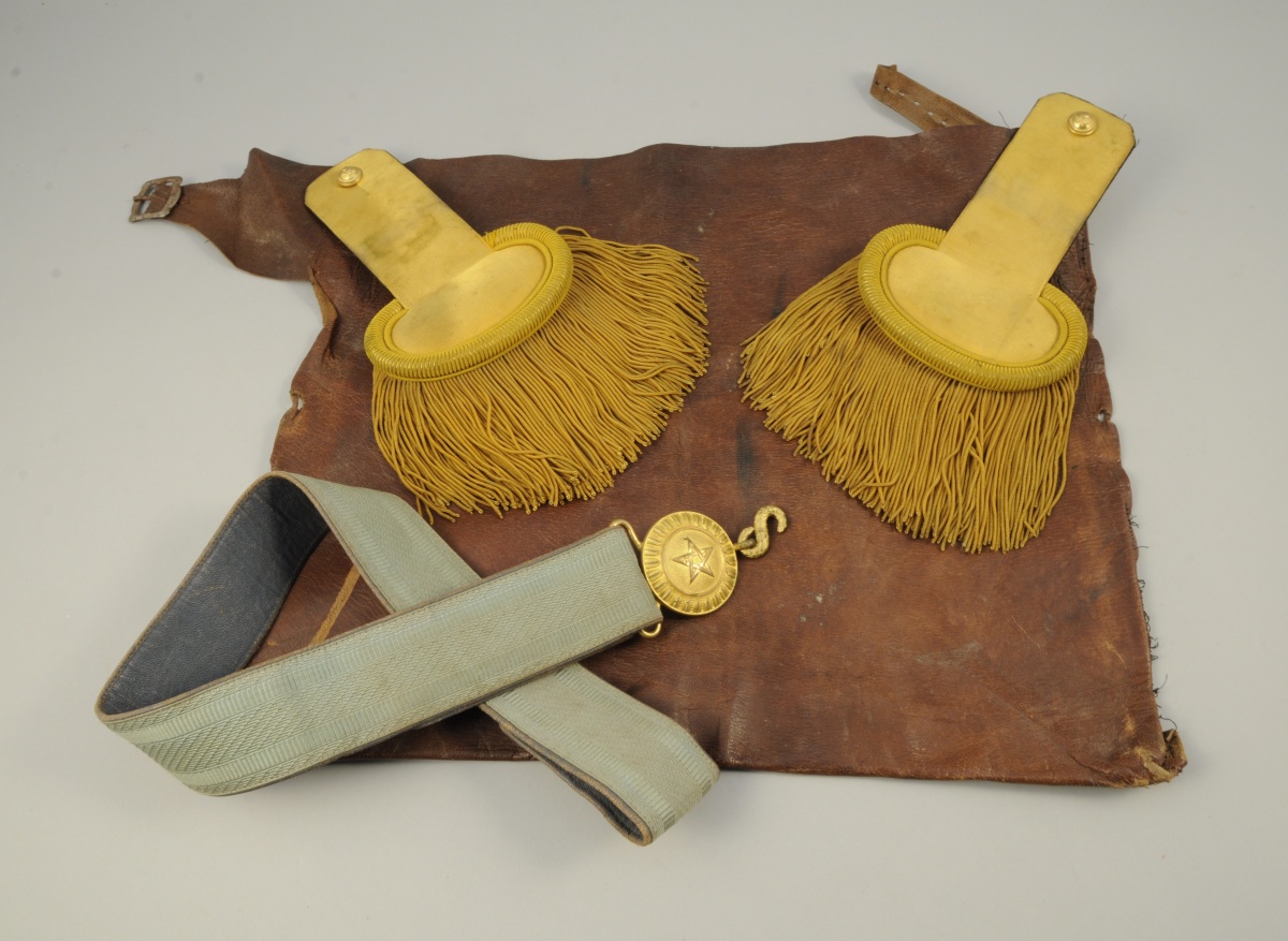 TABLIER en cuir brun. Boucle d'attache en métal (oxydation).