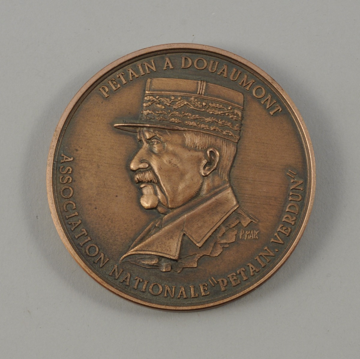 MARÉCHAL PÉTAIN (1856-1951). Médaille de forme ronde en cuivre patiné commémorant le dixième anniversaire de l'Association Nationale "Pétain Verdun". Figure, à l'avers, le maréchal en buste de profil avec la mention " PÉTAIN À DAUMONT / ASSOCIATION NATIONALE "PÉTAIN.VERDUN" " et au revers une francisque avec la mention "TRAVAIL - FAMILLE - PATRIE / 1972 - A.N.P.V. 10e ANNIVERSAIRE - 1982". Signée P. MARC.