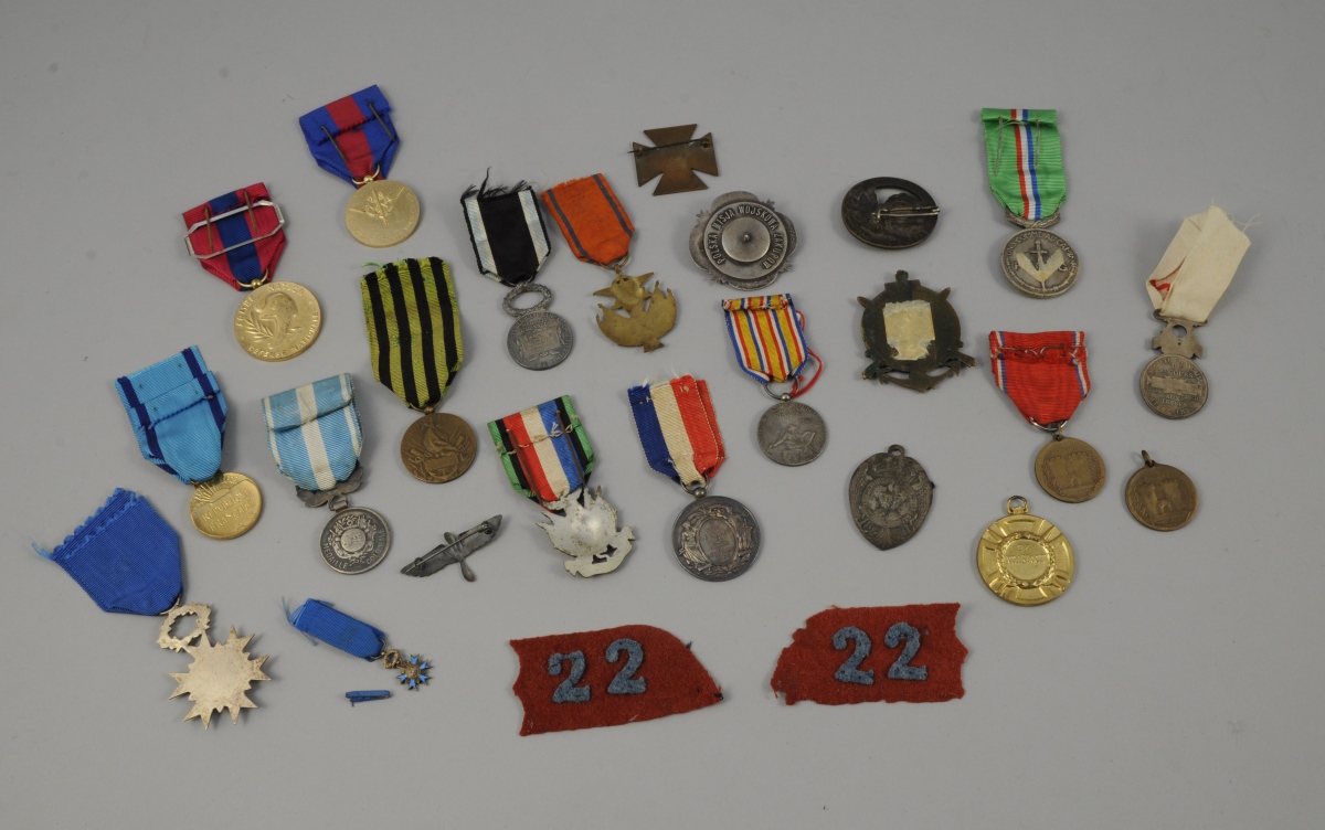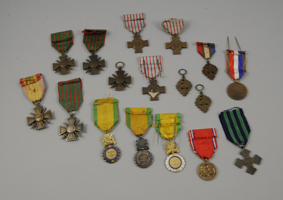 PHALÉRISTIQUE. COLLECTION d'environ 40 MÉDAILLES et insignes militaires divers dont : croix de guerre, médailles militaires, médailles serbes, médaille polonaise, Division Armor, Marine Napoléon III en argent, Mérite...
