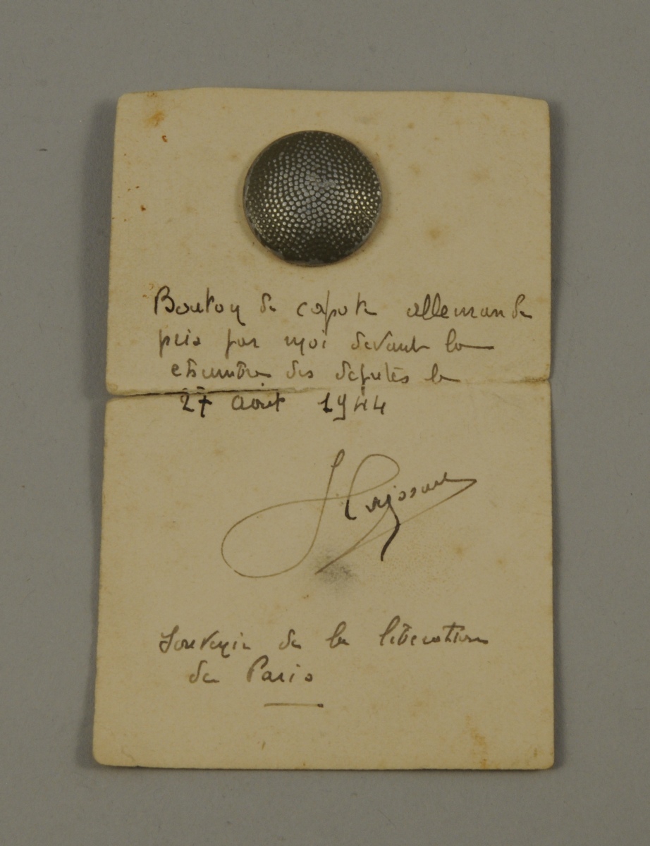 BOUTON D'UNIFORME en métal laqué vert feldgrau (manques) fixé sur une carte de visite portant l'inscription manuscrite à l'encre : "Bouton de capote allemande pris par moi devant la chambre des députés le 27 août 1944 / Souvenir de la libération de Paris"